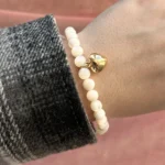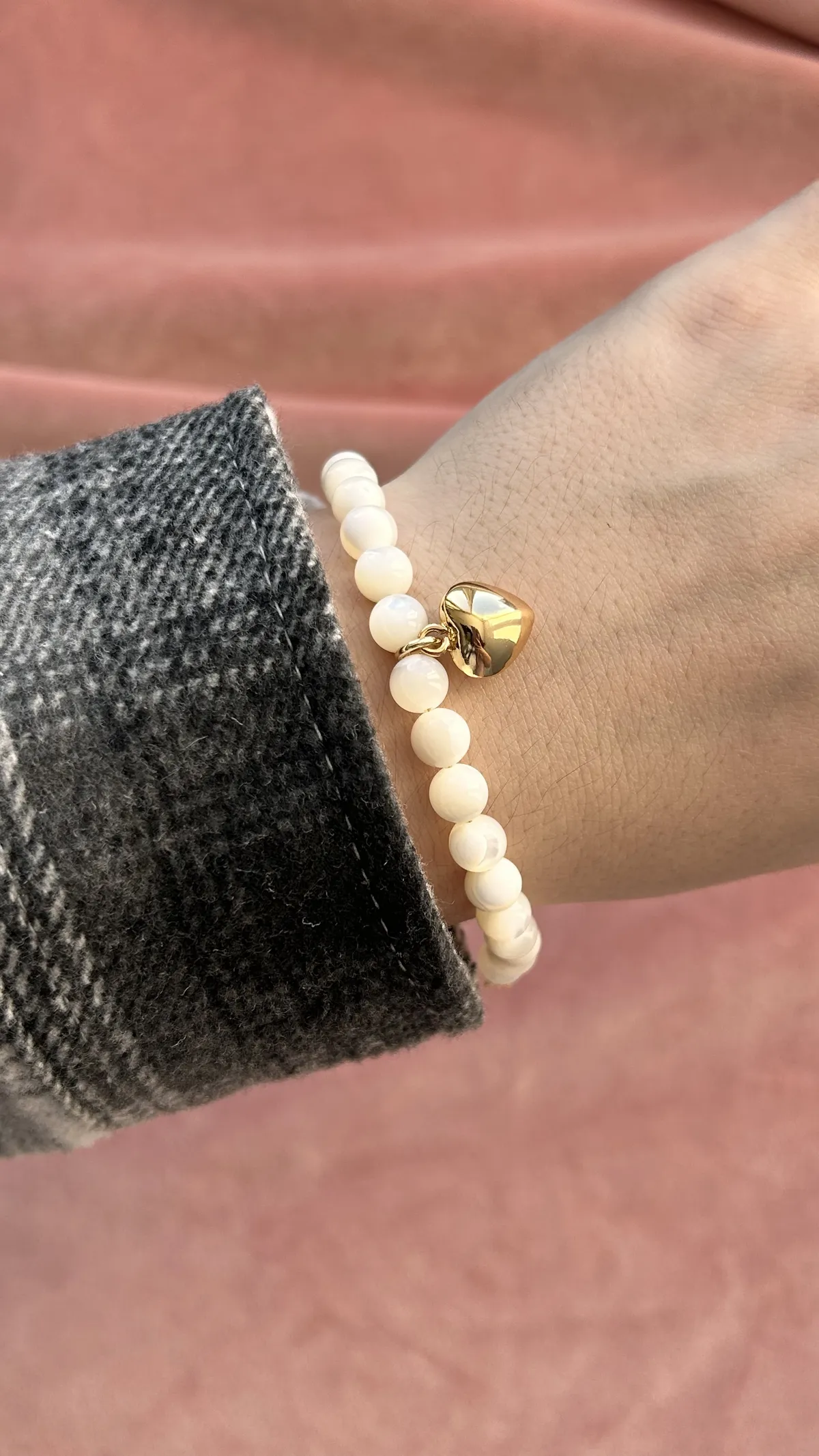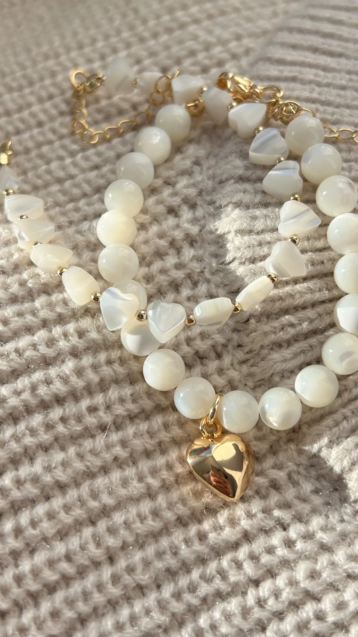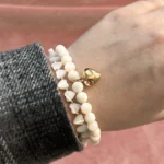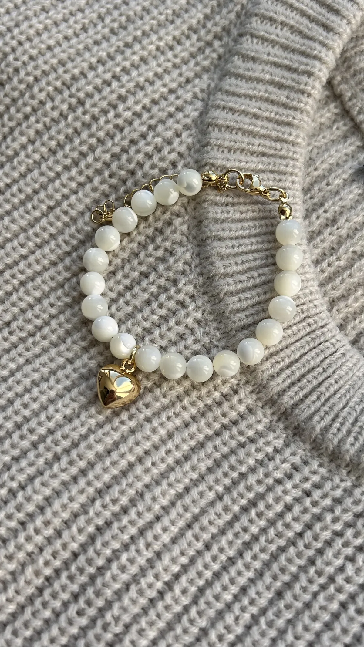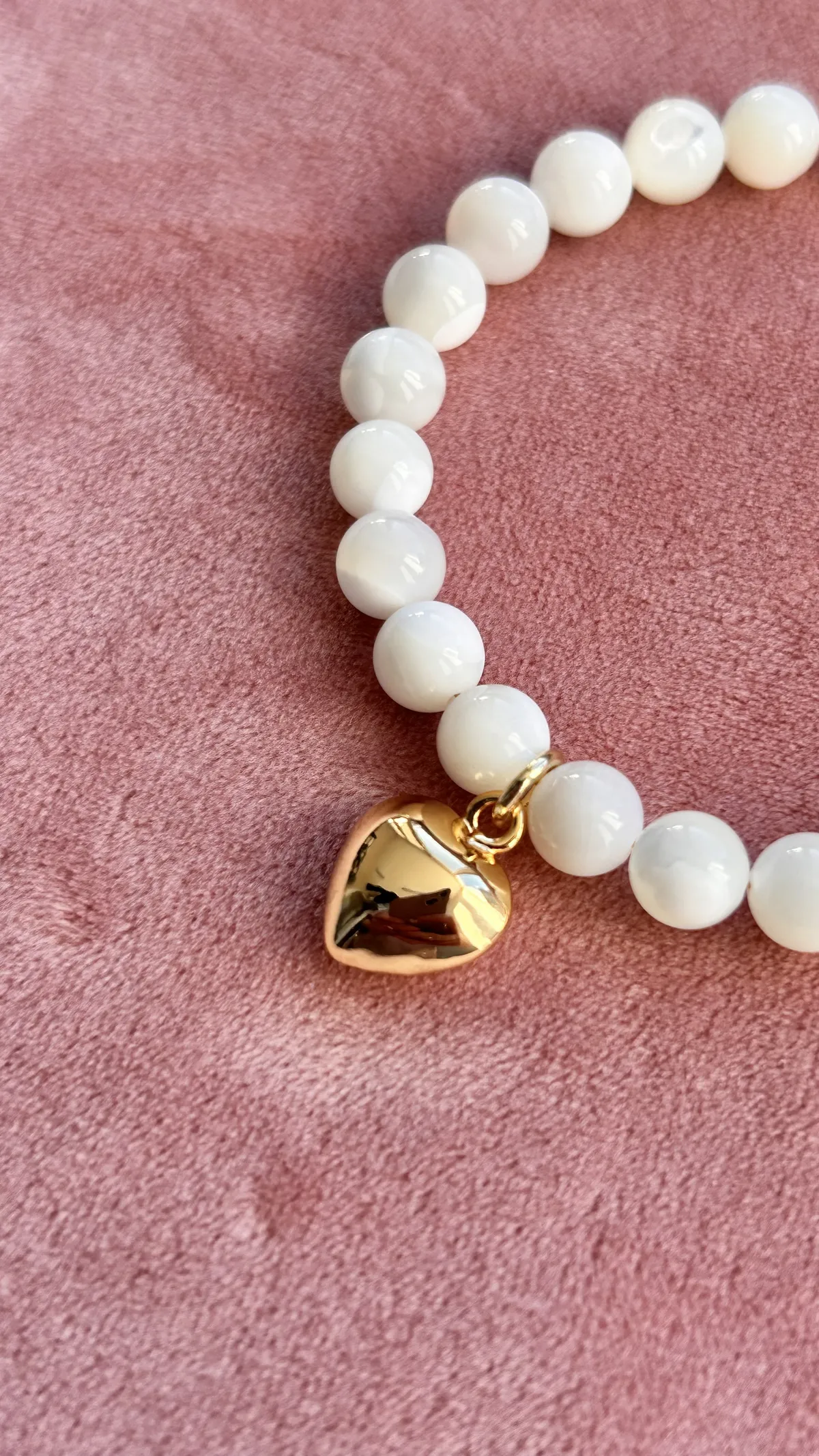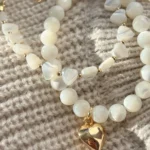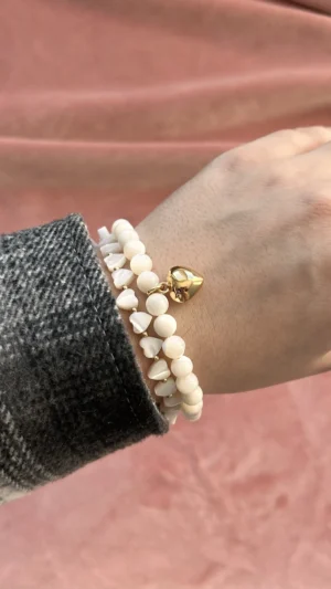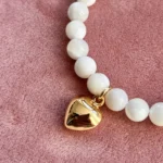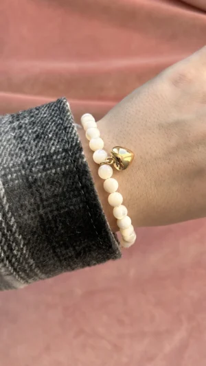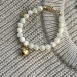 Оригинальный браслет из гладких белых бусин перламутра, украшенный подвеской “золотое сердце”. Символ любви и тепла. Универсальный аксессуар для нежных и женственных луков, а также прекрасный подарок близкому человеку.