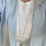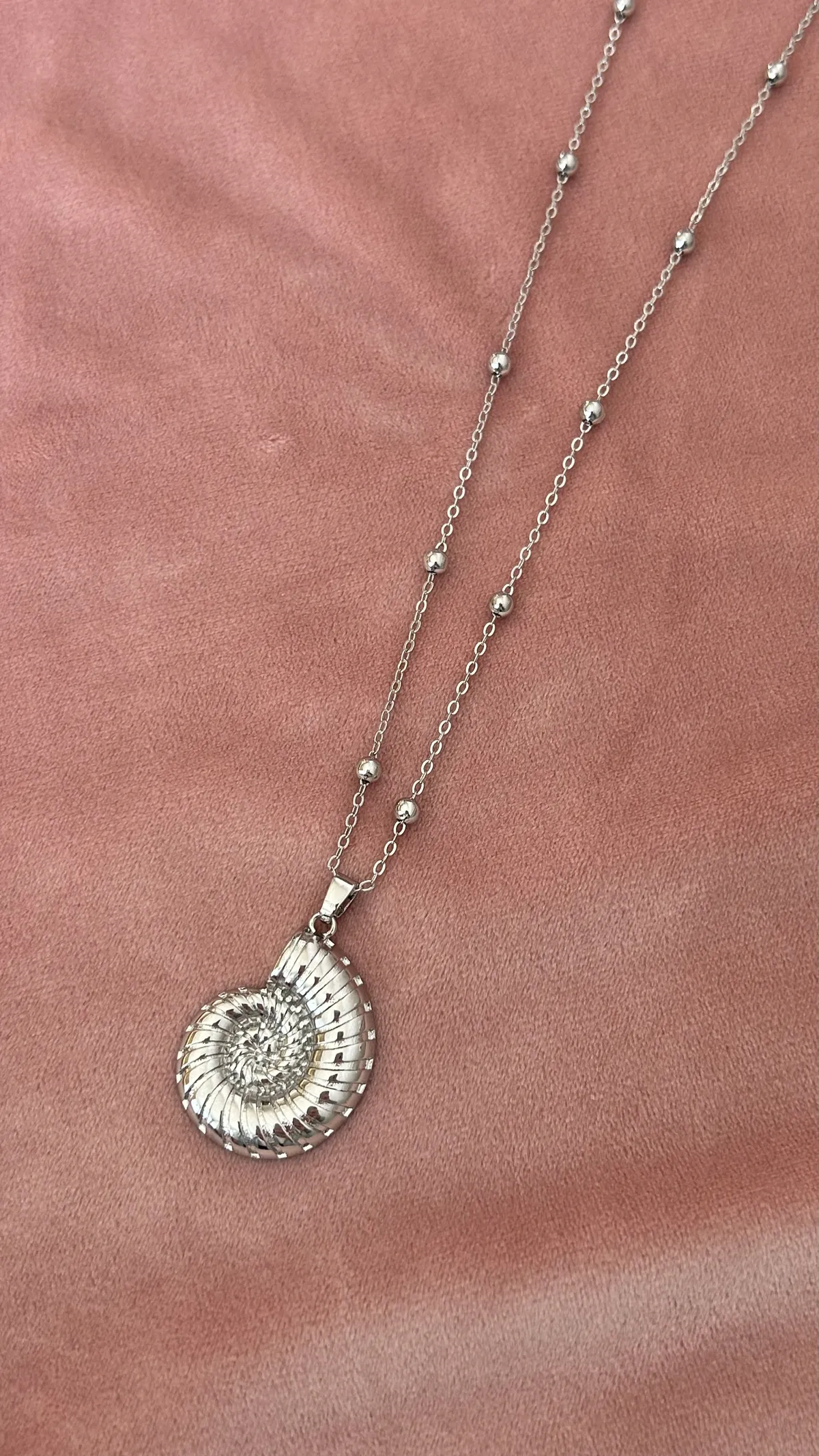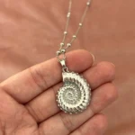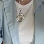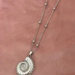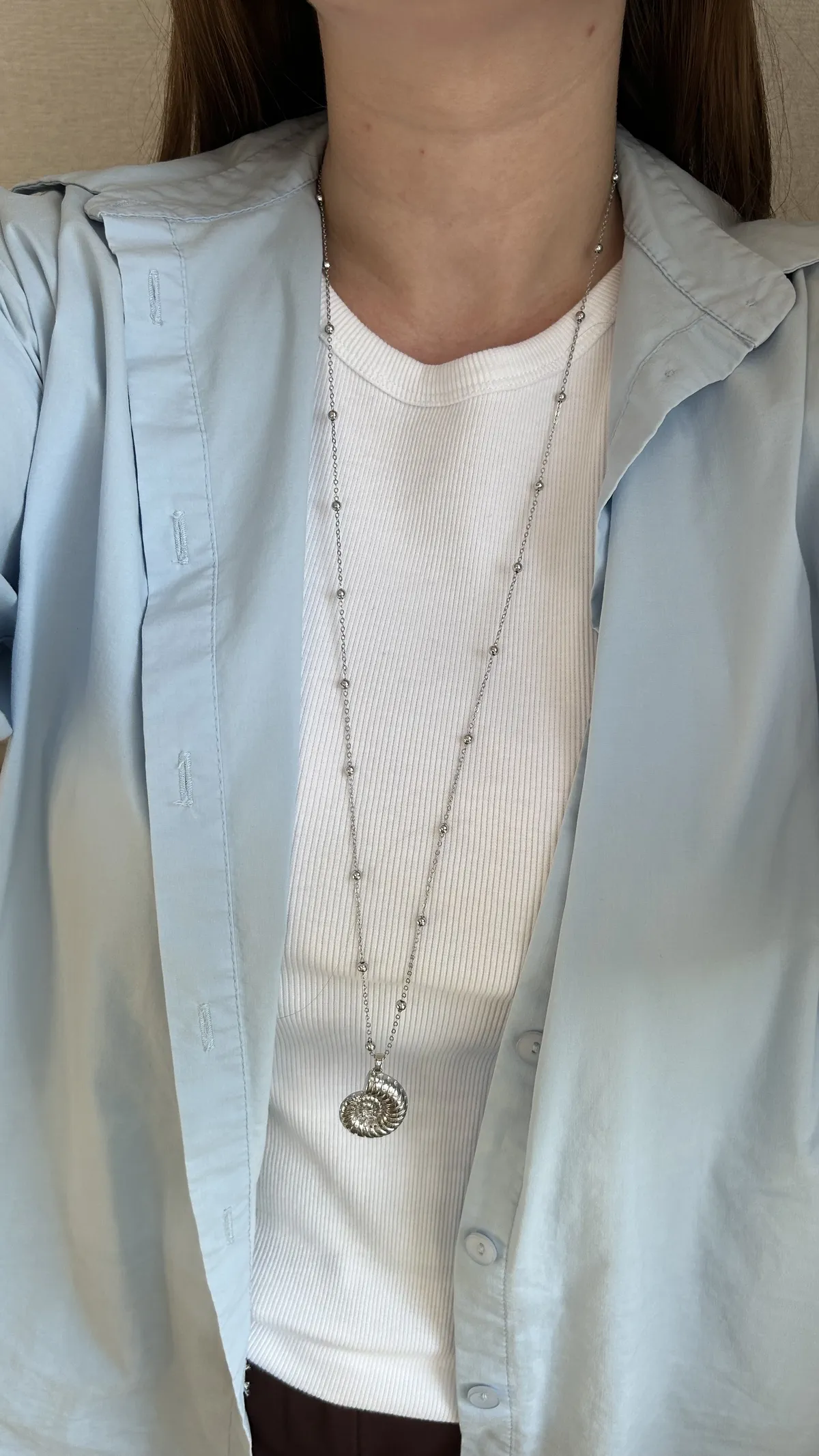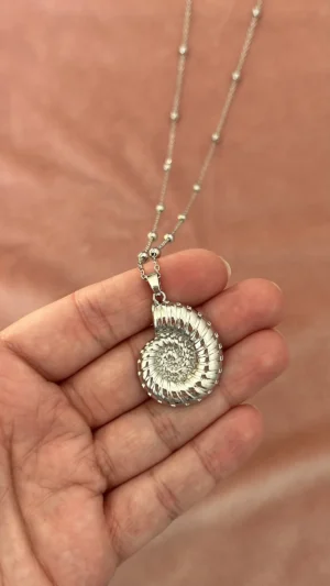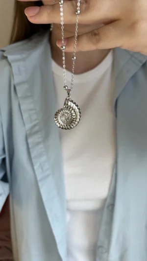 Это стильное длинное колье выполнено из серебристой цепочки с миниатюрными бусинами, равномерно распределёнными по всей длине. Центральным акцентом служит объемная подвеска в виде морского аммонита — древнего символа гармонии и вечности. Украшение элегантно смотрится как с базовыми футболками и рубашками, так и с деловыми или вечерними нарядами, придавая образу изысканность и индивидуальность.