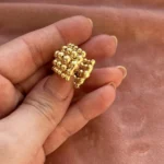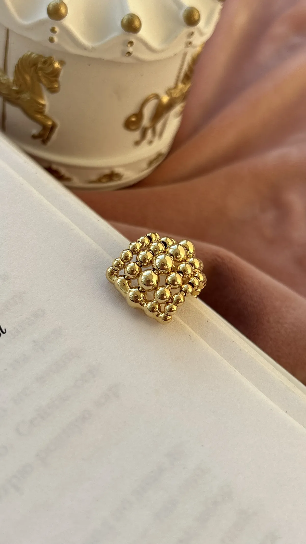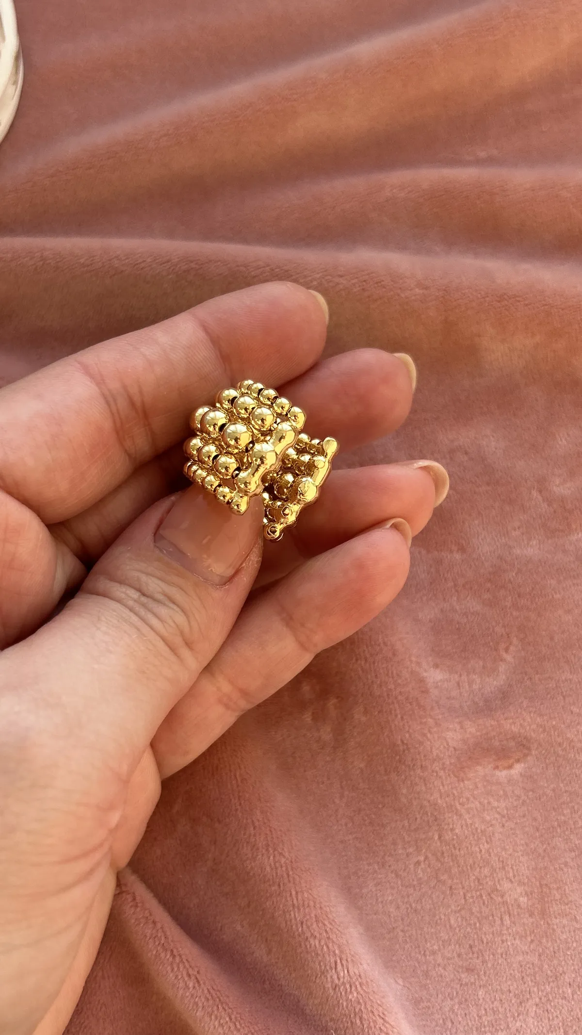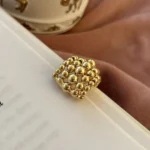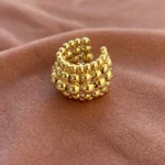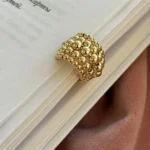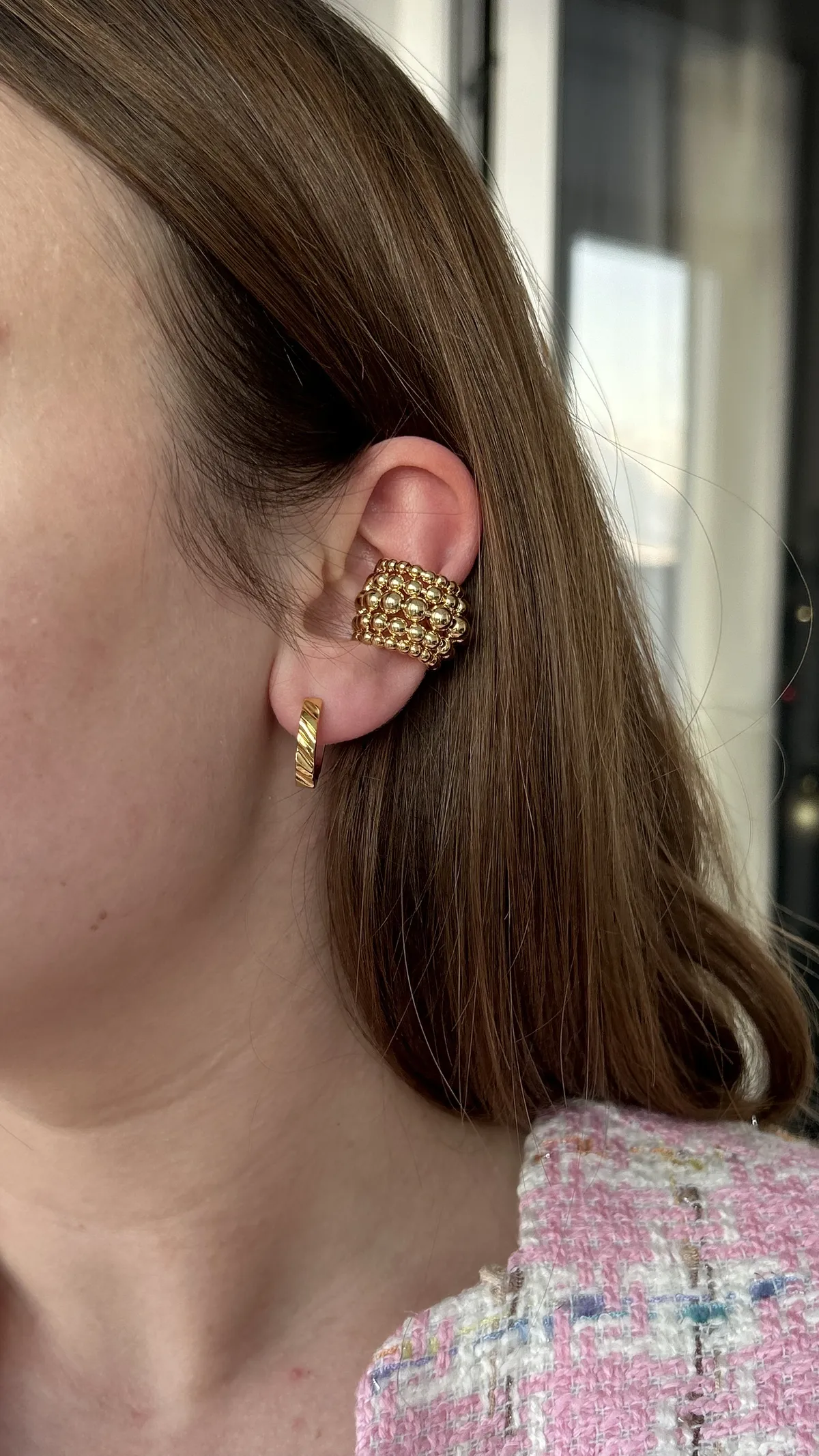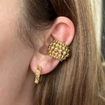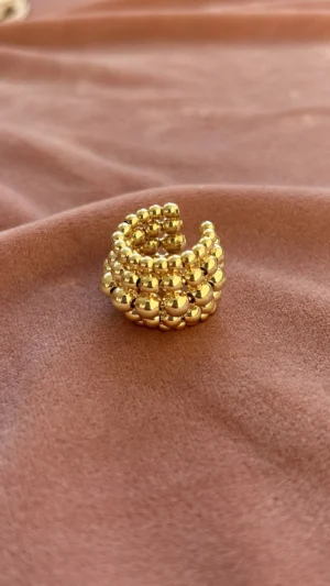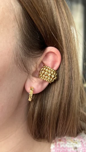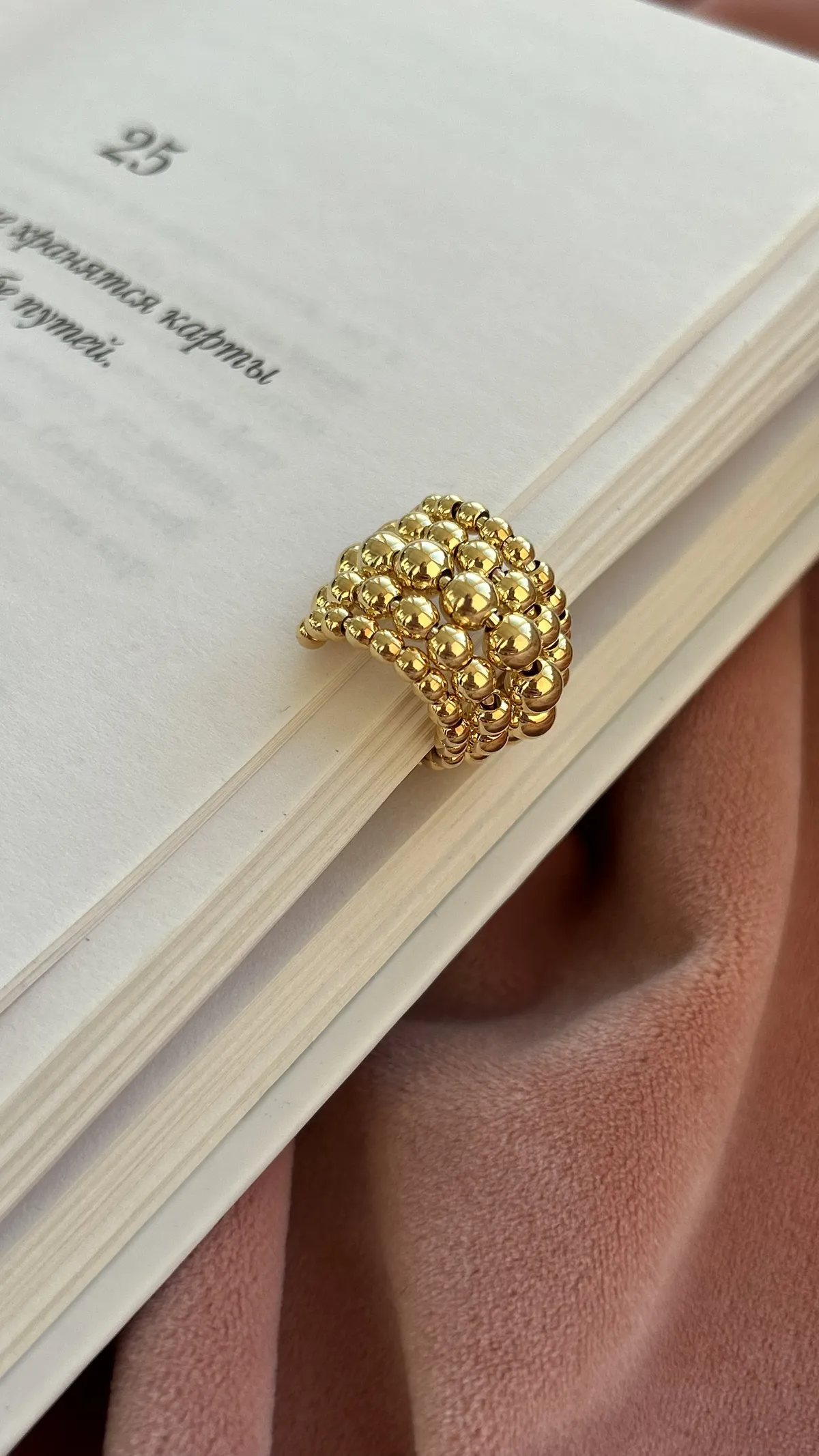 Объёмный кафф, выполненный в виде широкой полосы из золотистых шариков и бусин, эффектно покрывающих край уха. Стильный акцент с игривой текстурой, который гармонично сочетается как с классическими, так и с кэжуал-образами.
