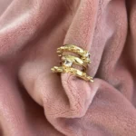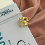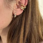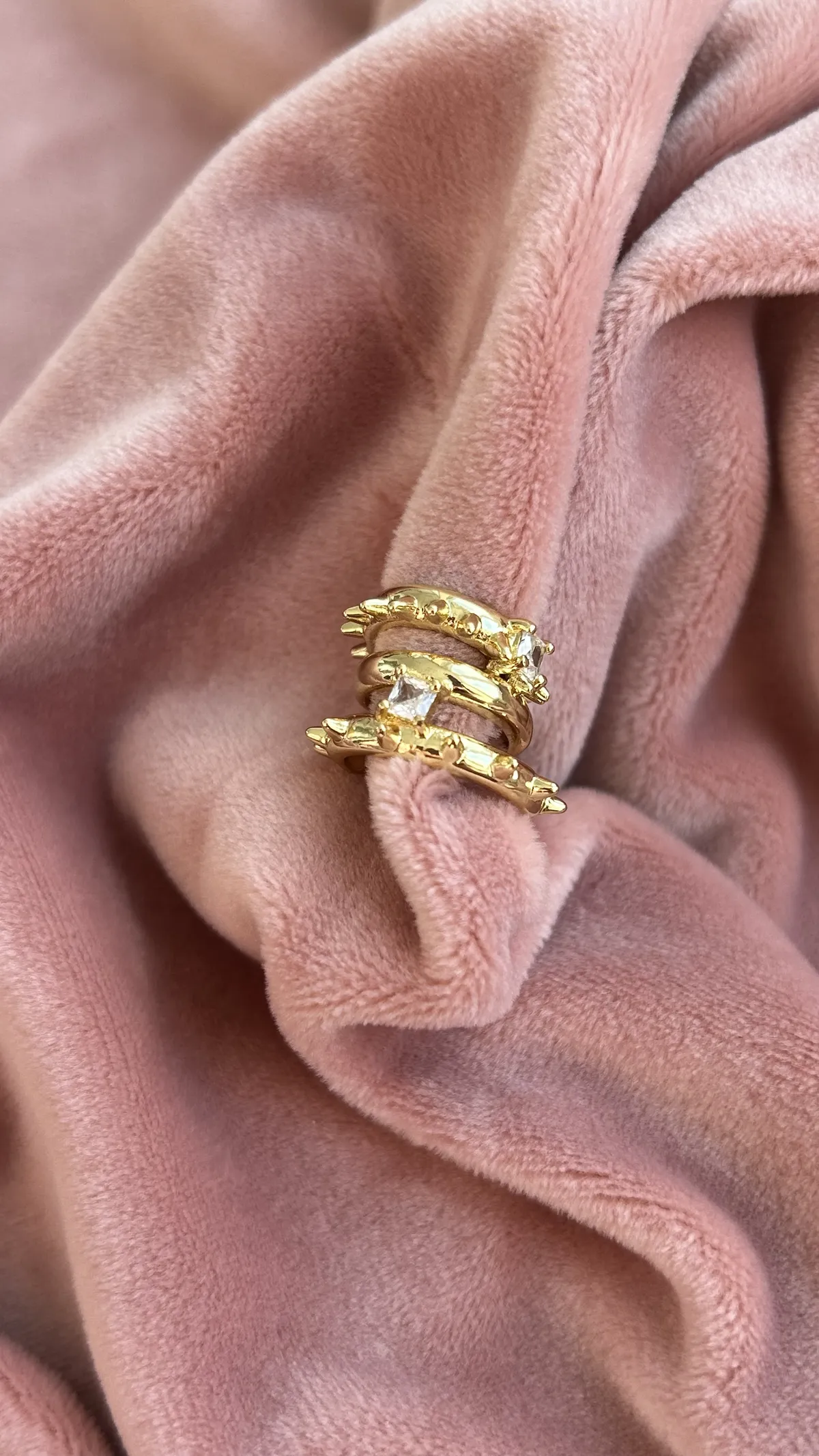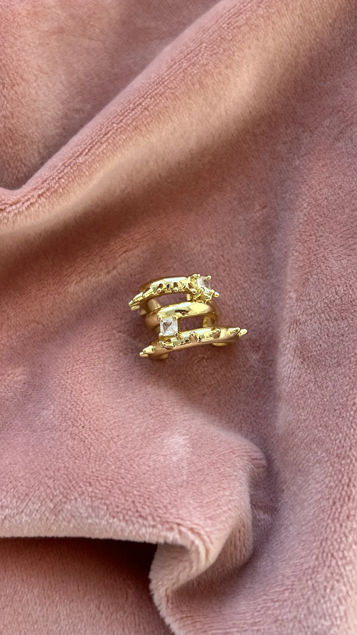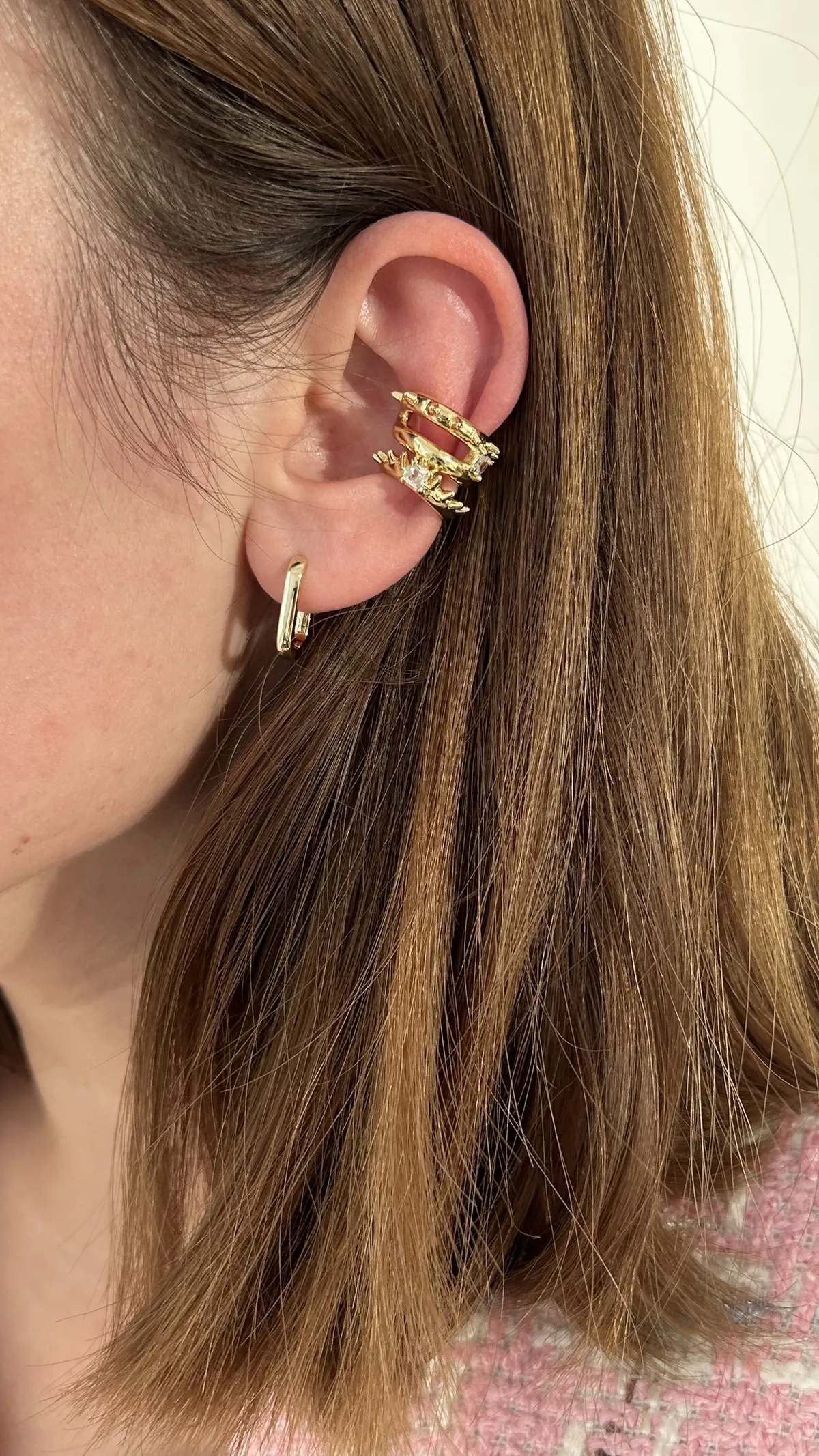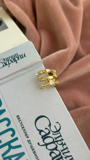 Яркий двойной кафф золотистого цвета с рельефной фактурой и россыпью крупных и мелких камней — настоящий statement-аксессуар для уха. Креативное сочетание массивности и блеска придаёт образу дерзости и акцентирует внимание на ухе, даже если у вас нет проколов в верхней части.