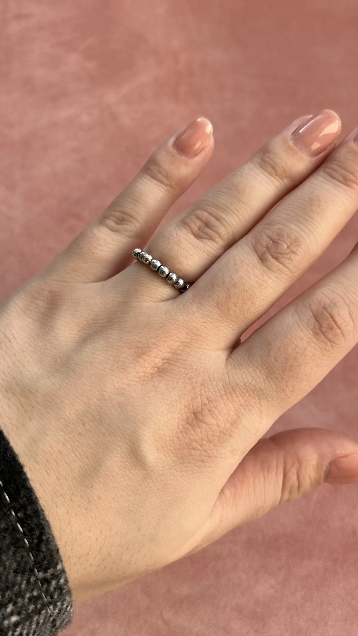 Лёгкое колечко из серебристых бусин — символом нежности и внимания к деталям. Прекрасно подойдет для ежедневной носки, сочетаясь с любым стилем и даря немного романтики каждому дню. Можно дополнять другими колечками.