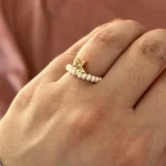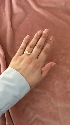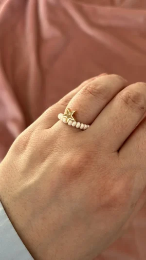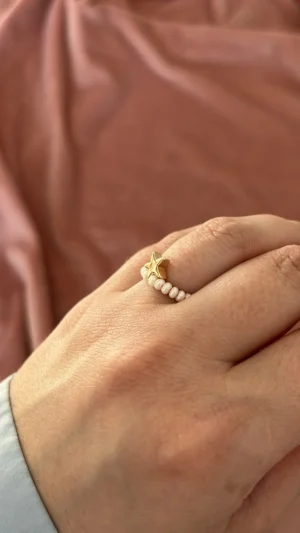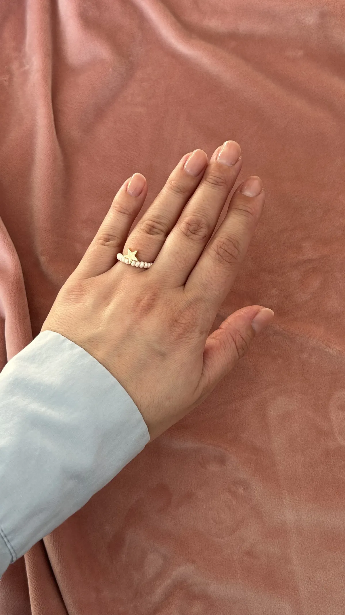 Кольцо из жемчужных бусин с золотистой звездой. Лёгкое, универсальное и сияющее украшение.