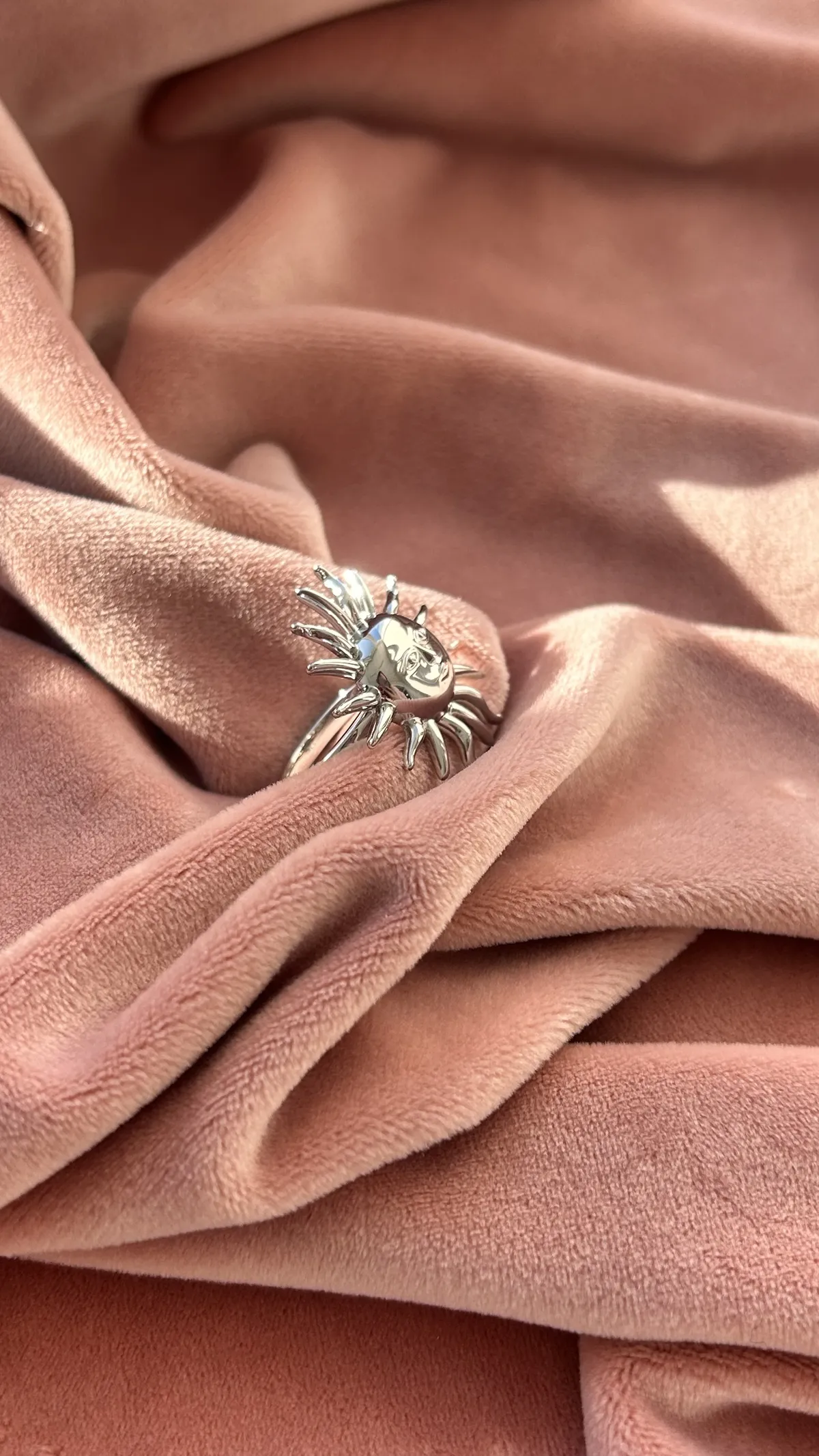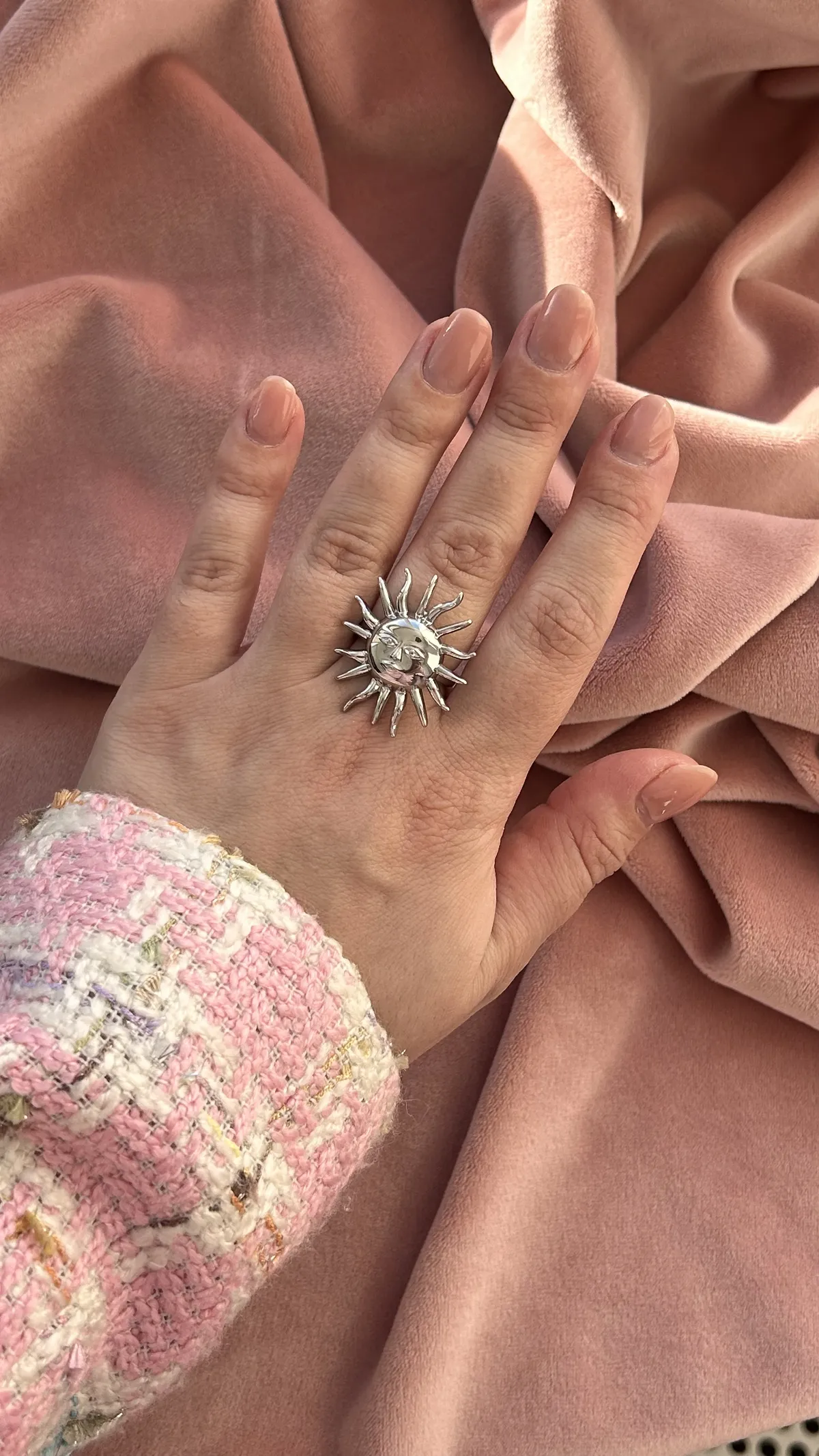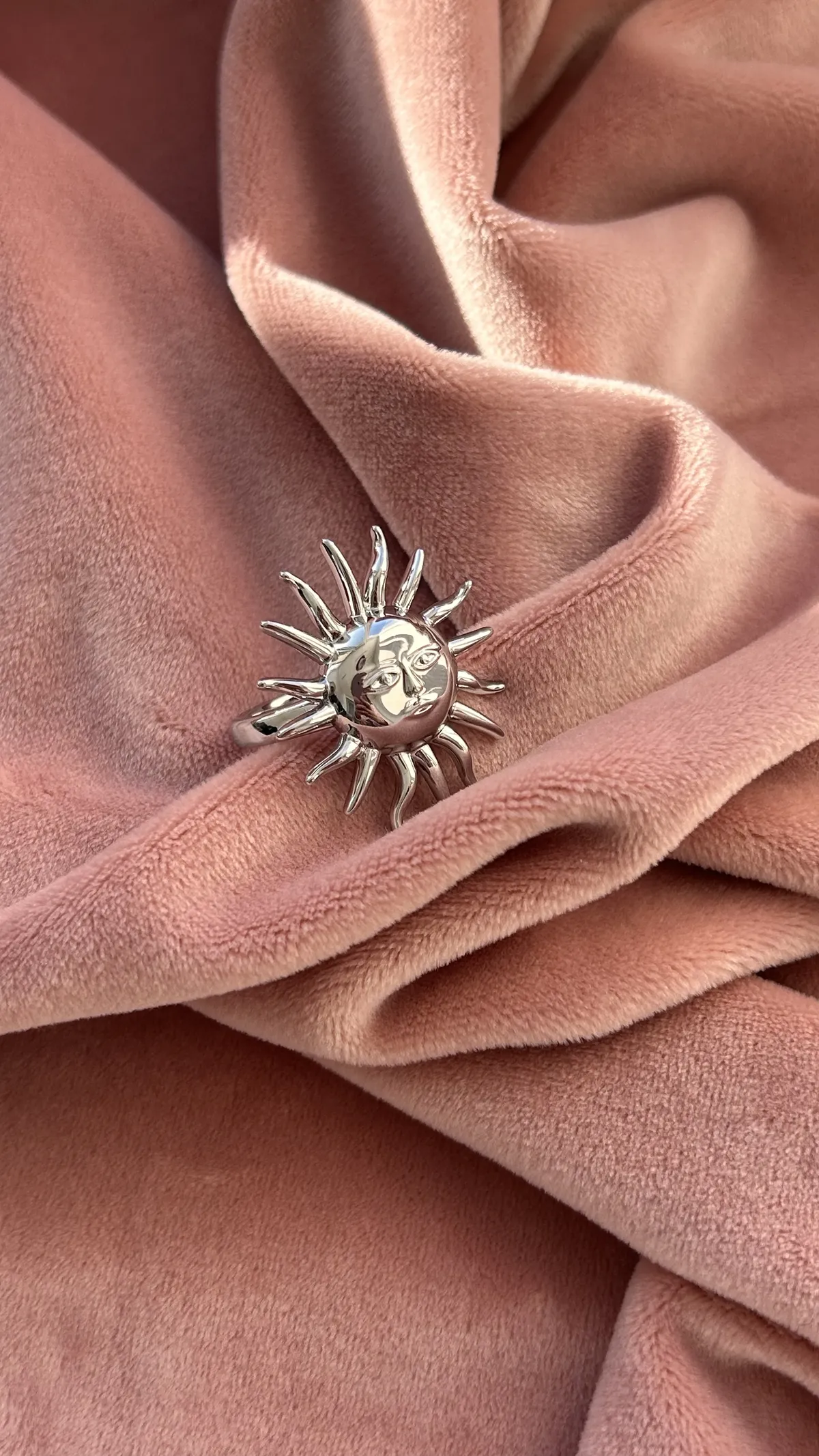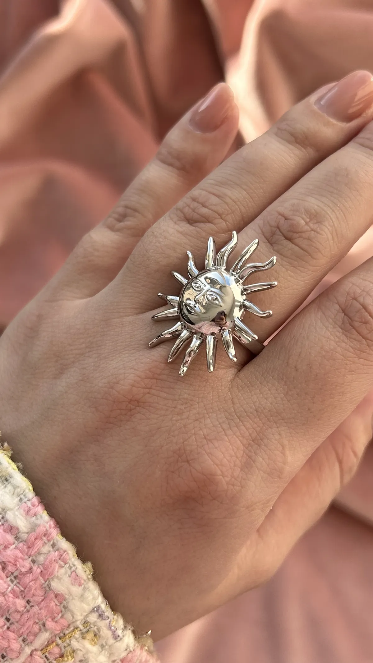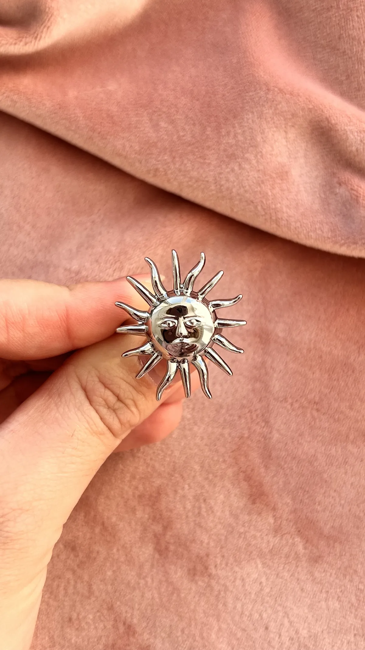 Яркое кольцо в форме солнца с сияющим лицом в центре. Массивное и выразительное украшение подчеркнёт ваш стиль и добавит солнечного настроения любому образу. Отличный вариант для подарка и эффектных фото.