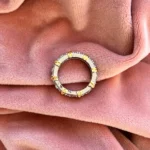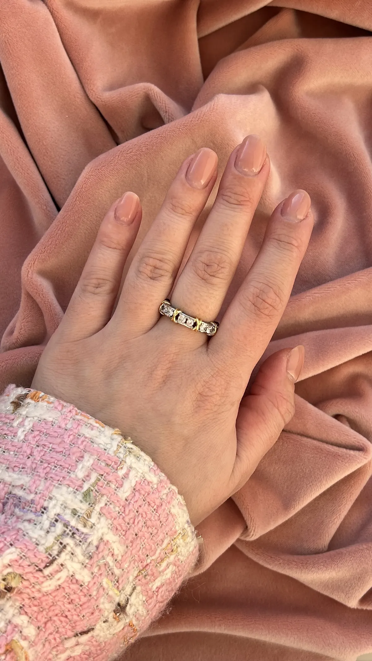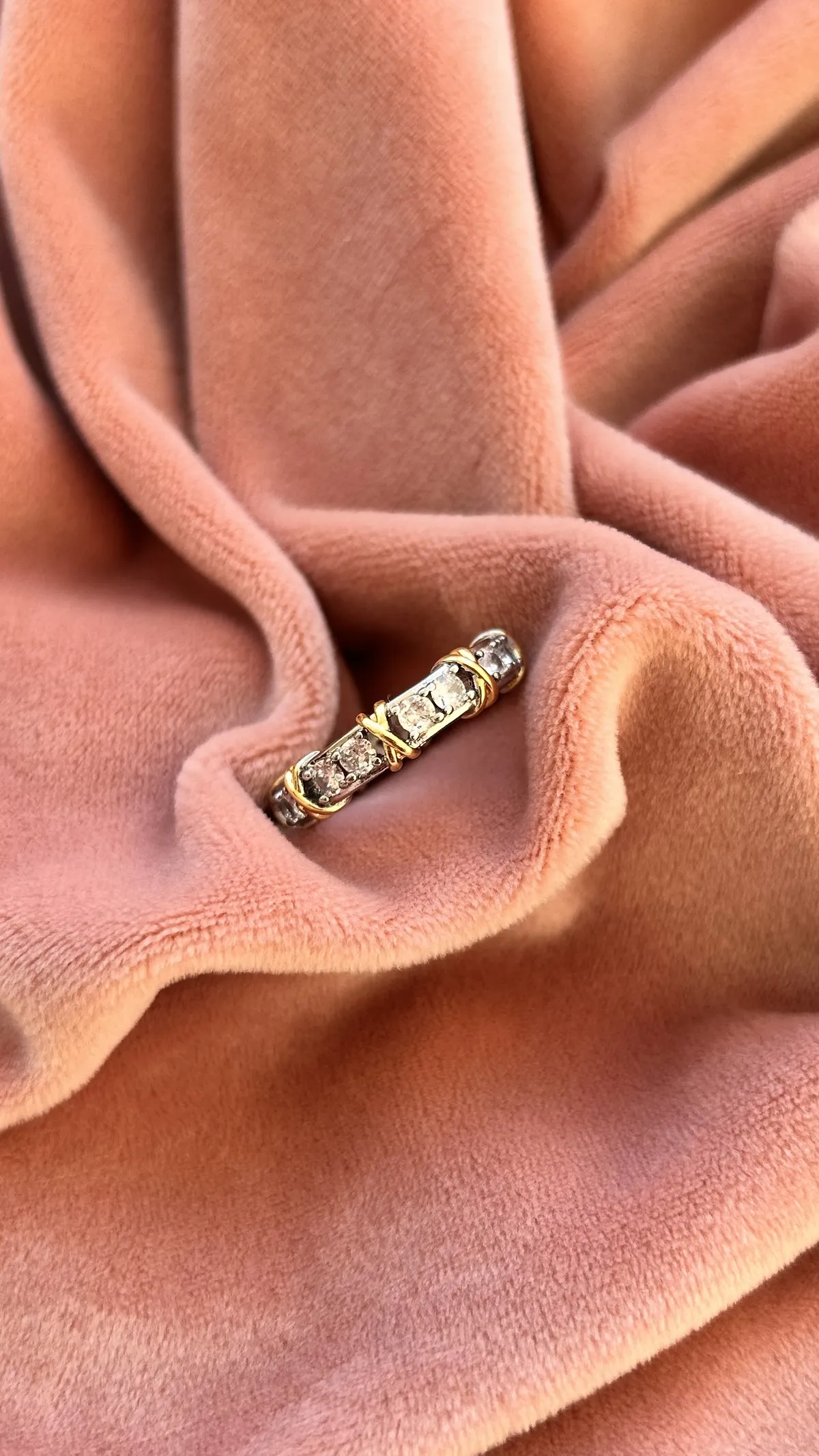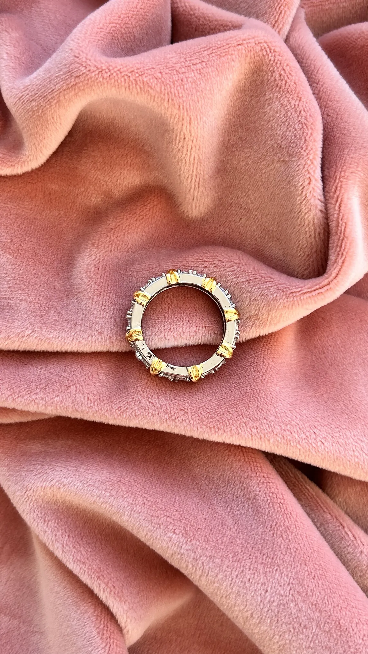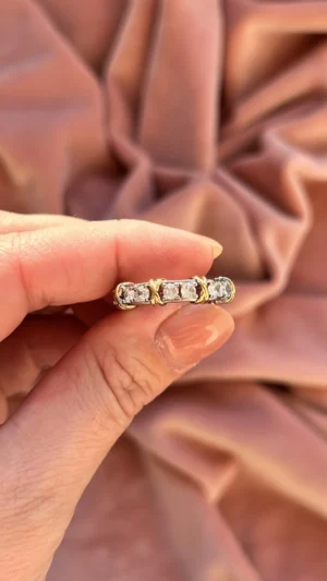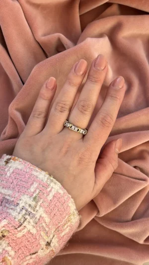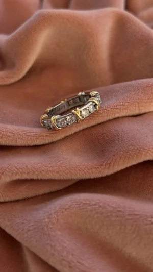 Кольцо-вечность, украшенное сияющими камнями, закреплёнными в серебристой оправе и оформленное элегантными золотыми вставками в виде изящных «X». Символ крепкой и неразрывной связи, гармонии двух начал и безупречного вкуса. Изысканное украшение привлекает внимание роскошным блеском и насыщенными деталями. Идеальный выбор для особых случаев и ярких акцентов в повседневном образе.