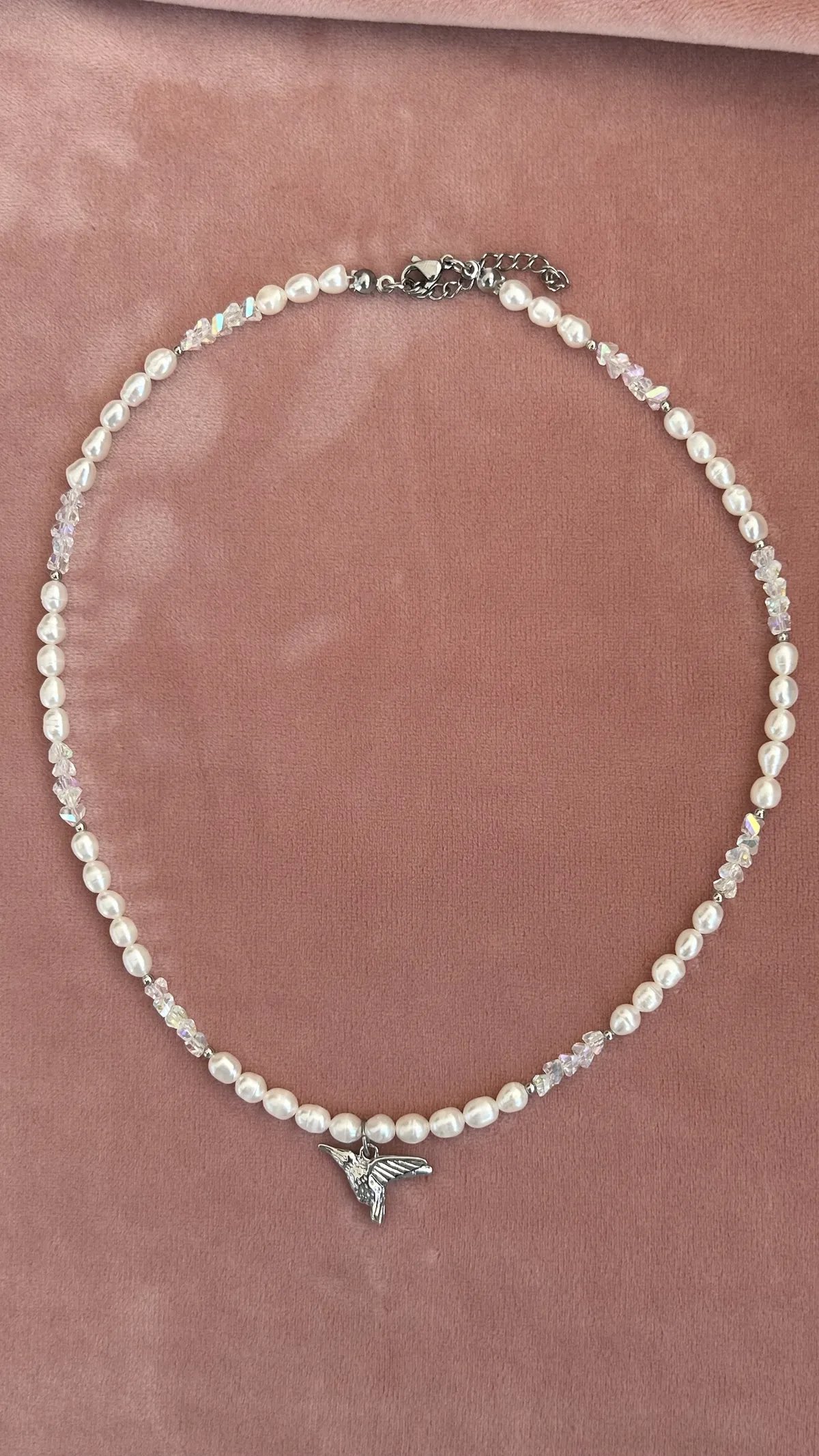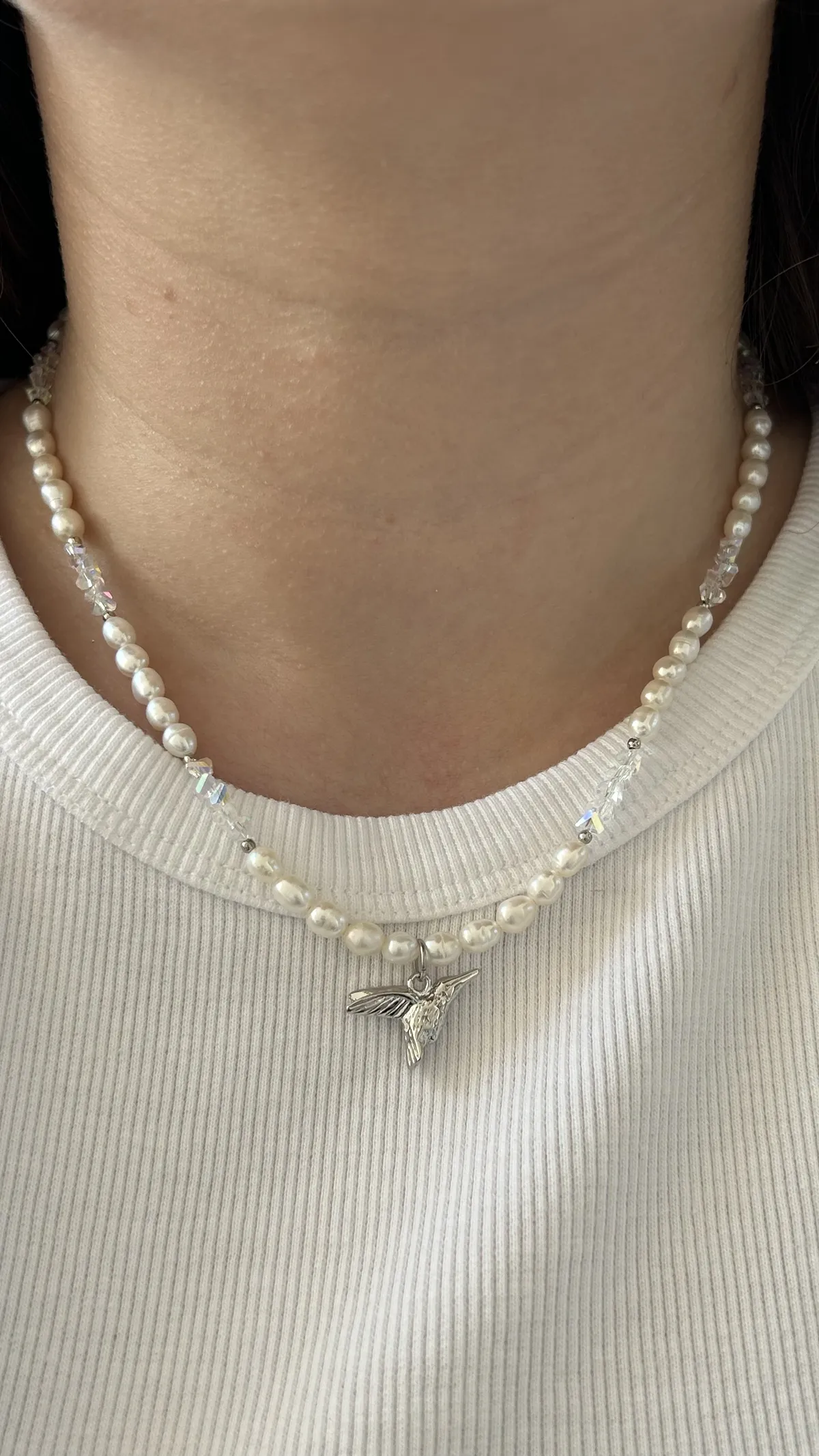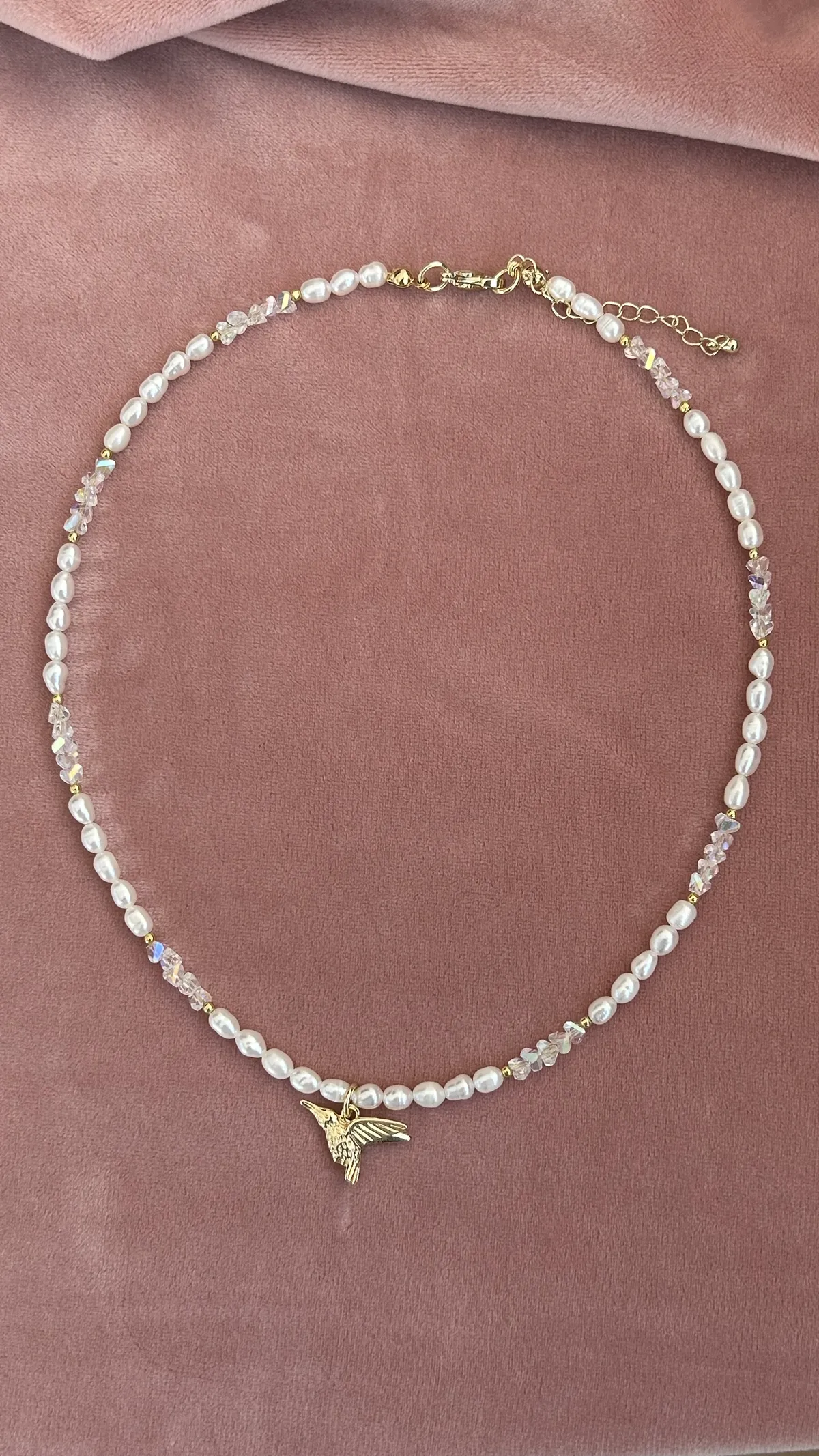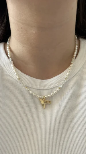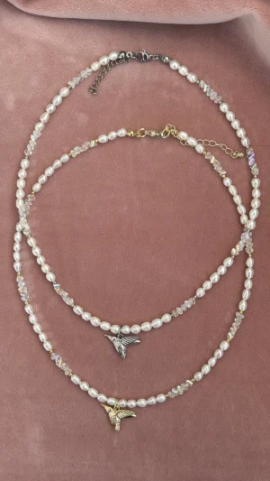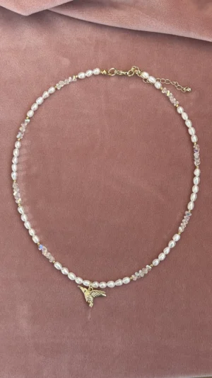 Нежное колье с натуральным жемчугом, подвеской-колибри и сияющим ювелирным стеклом. Универсальный аксессуар для любого случая.