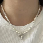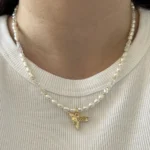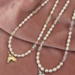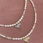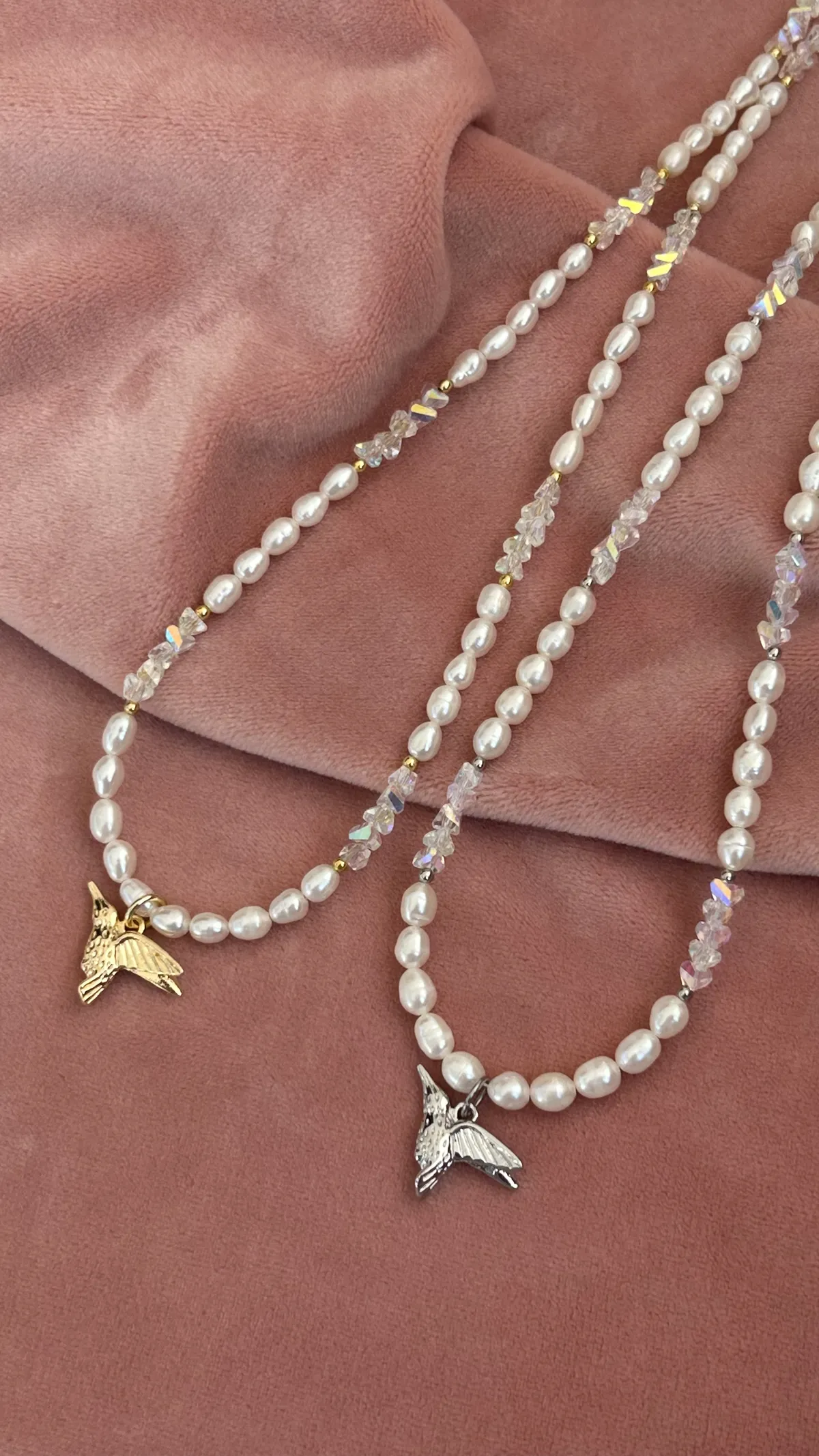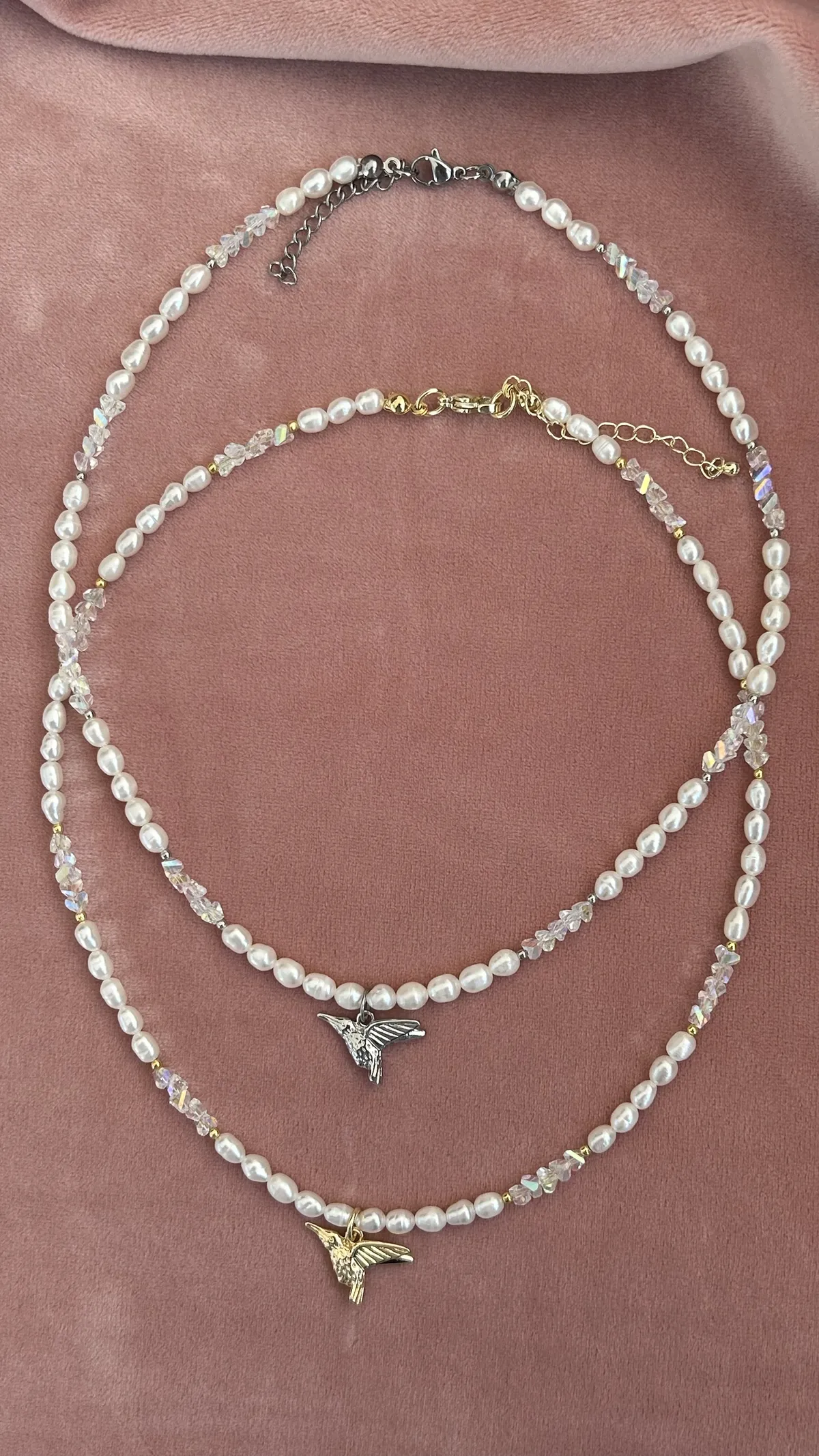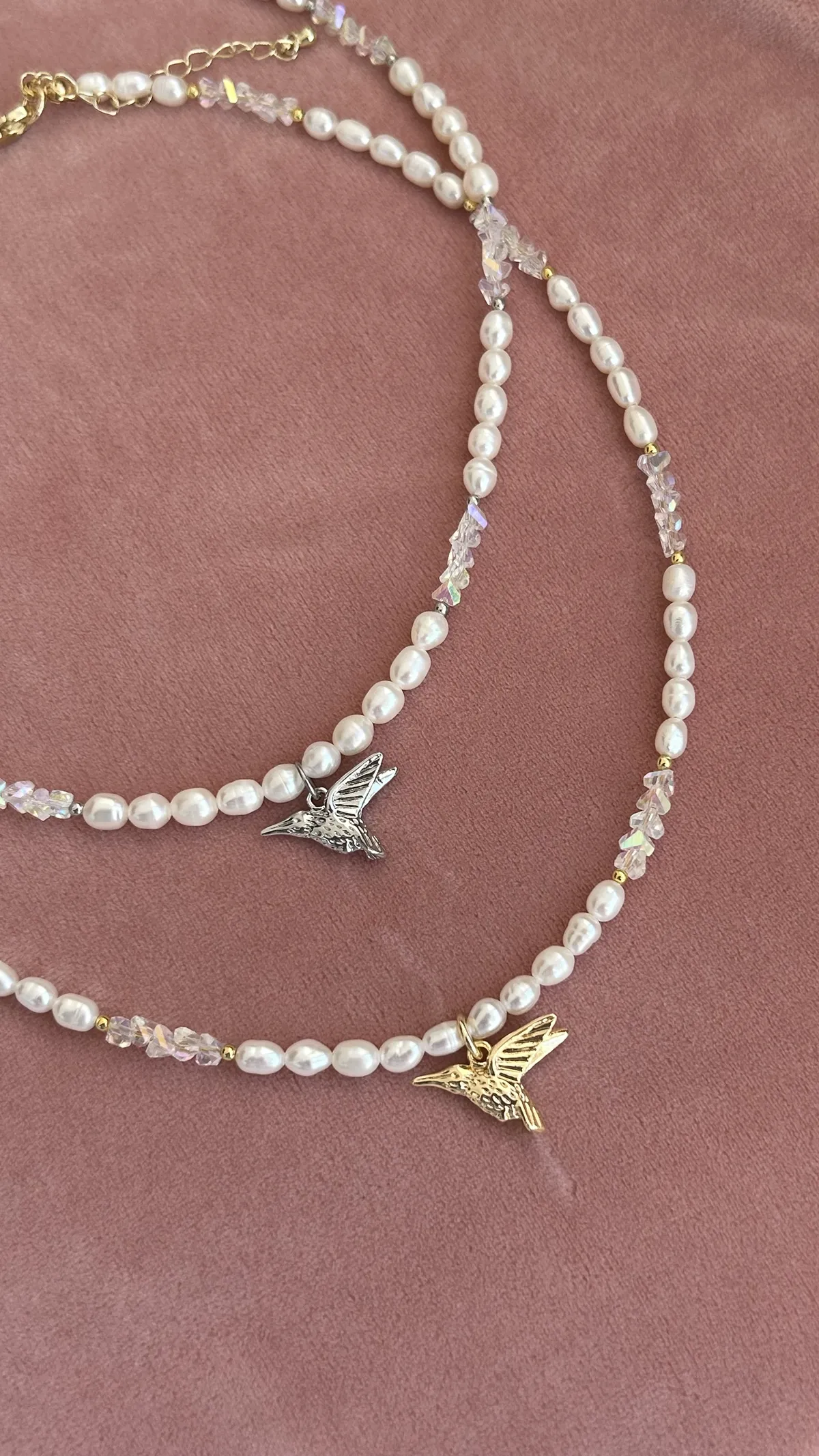 Нежное колье с натуральным жемчугом, подвеской-колибри и сияющим ювелирным стеклом. Универсальный аксессуар для любого случая.