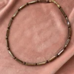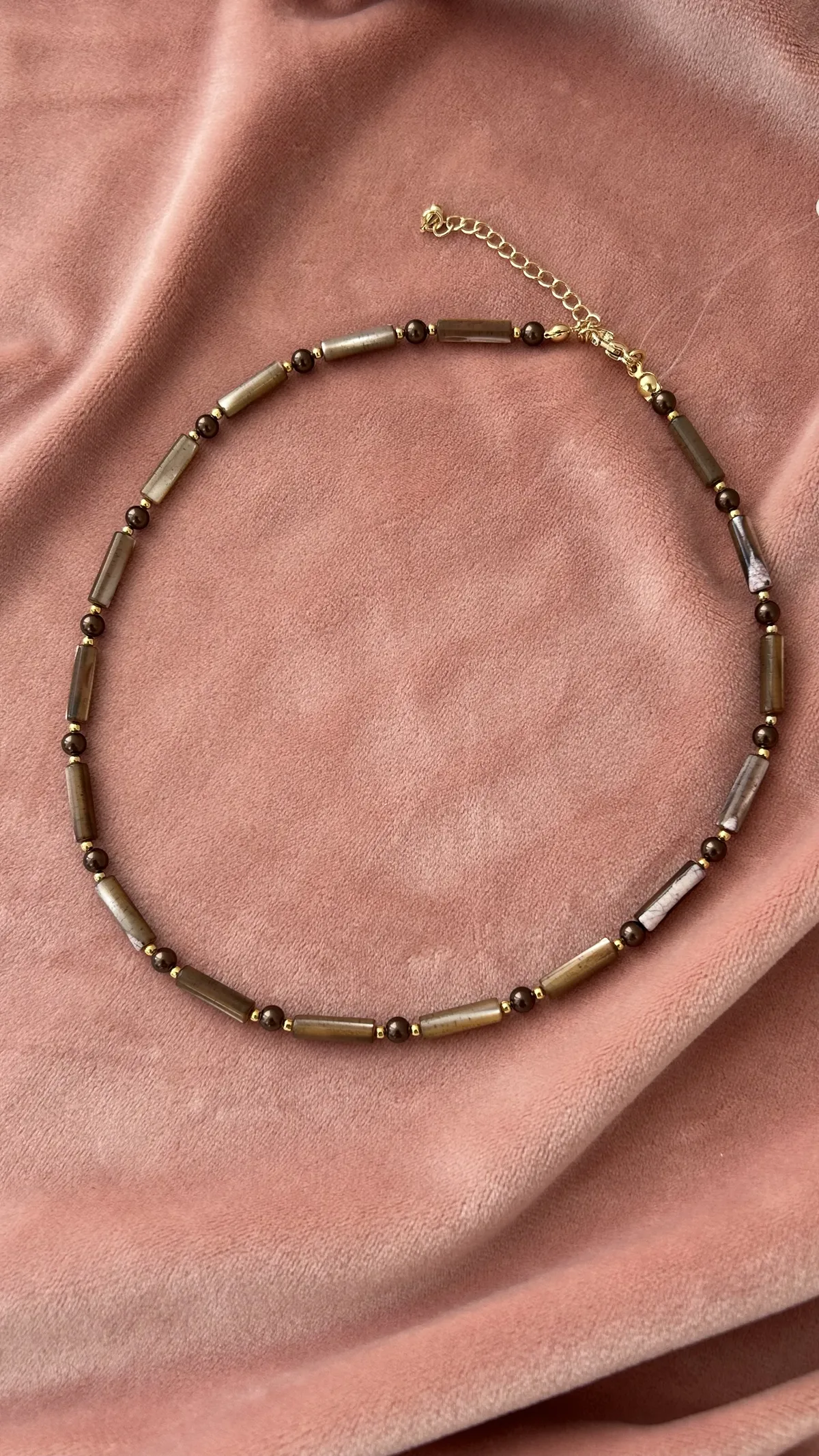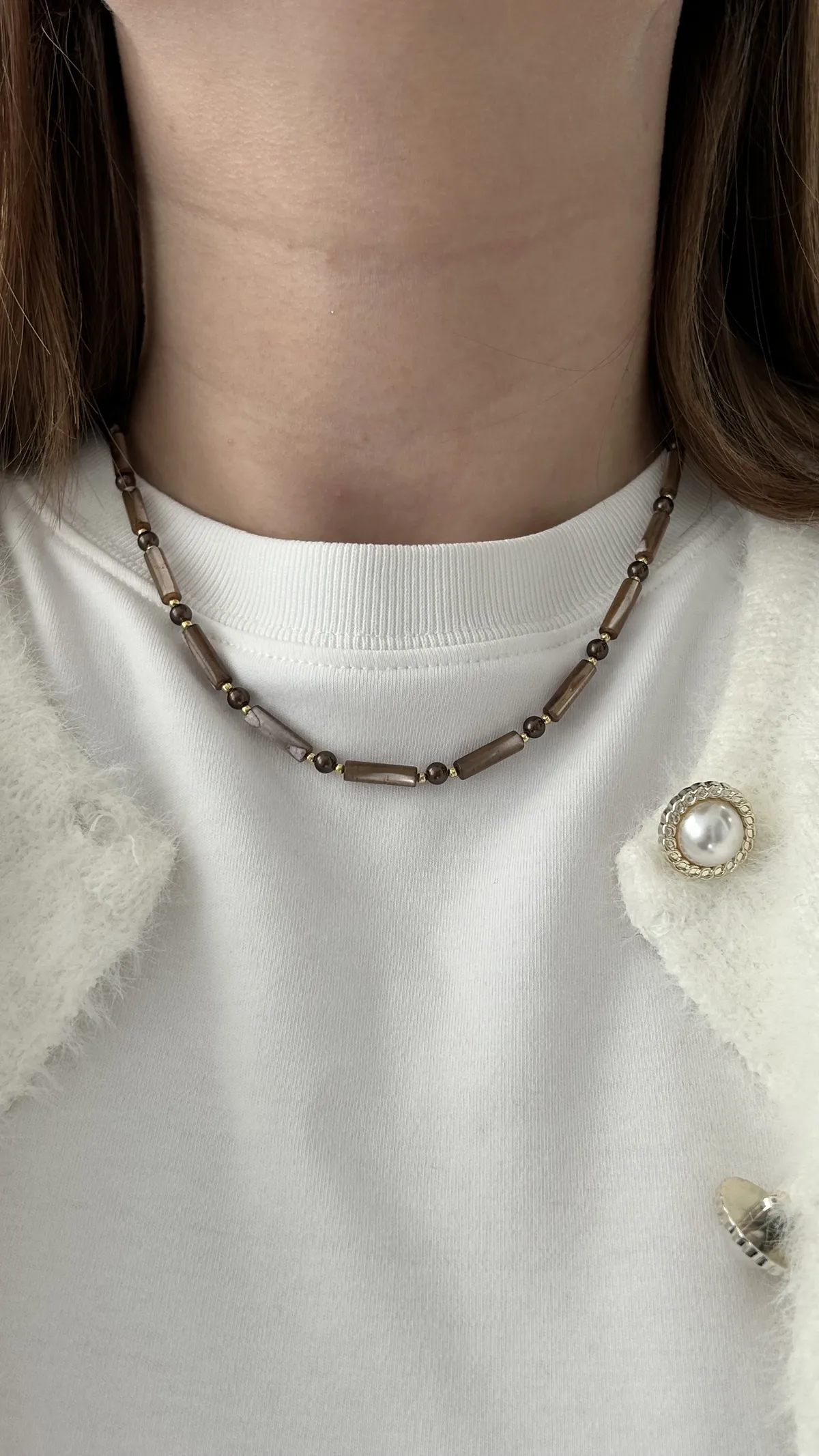Элегантное колье, выполненное в шоколадно-карамельной гамме. В его основе — чередование вытянутых цилиндрических бусин перламутра и гладких шоколадных жемчужин. Такой аксессуар универсален: он прекрасно дополняет как офисный, так и вечерний наряд, подчёркивая утончённость и природный вкус своей обладательницы.