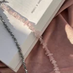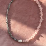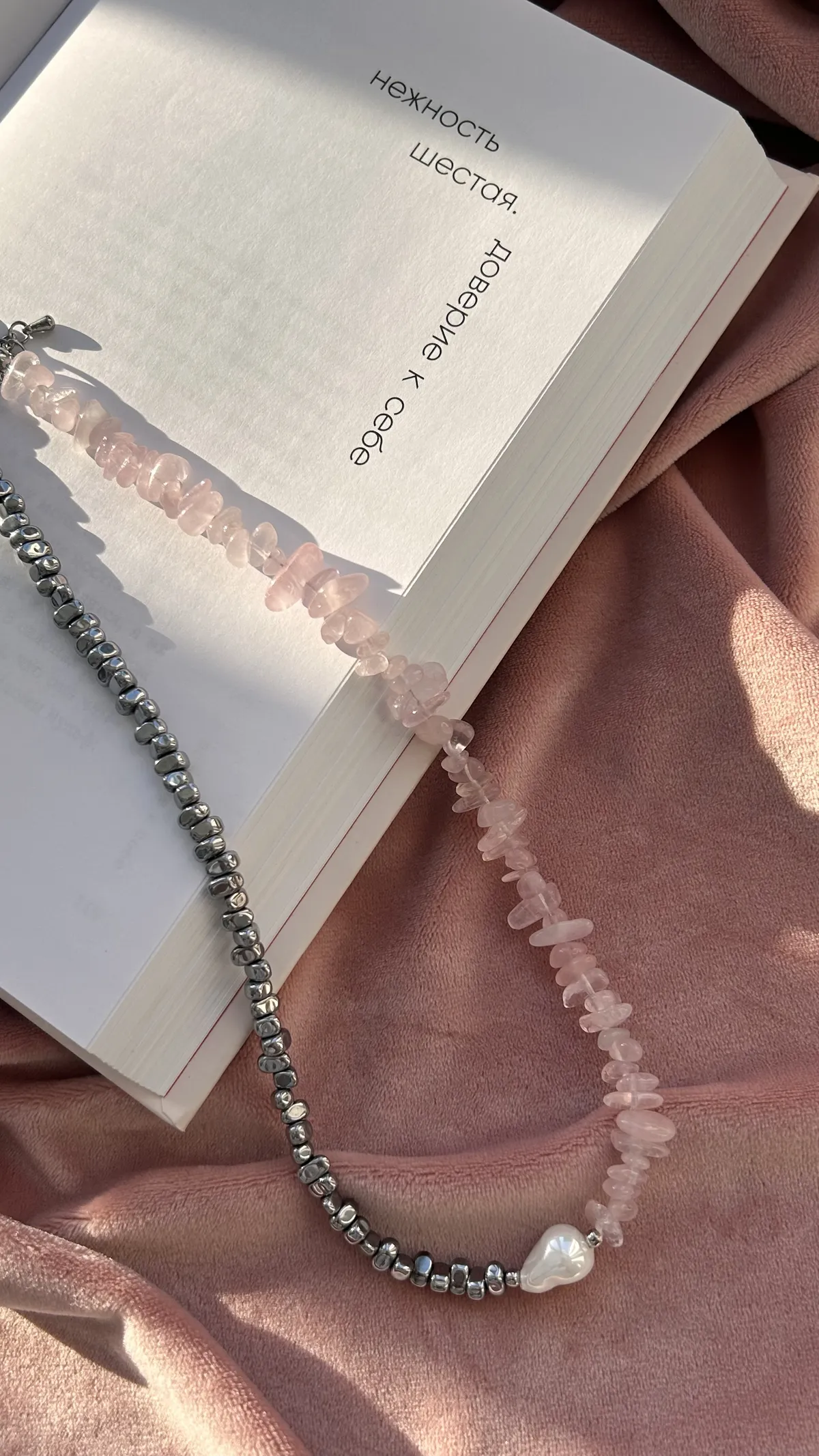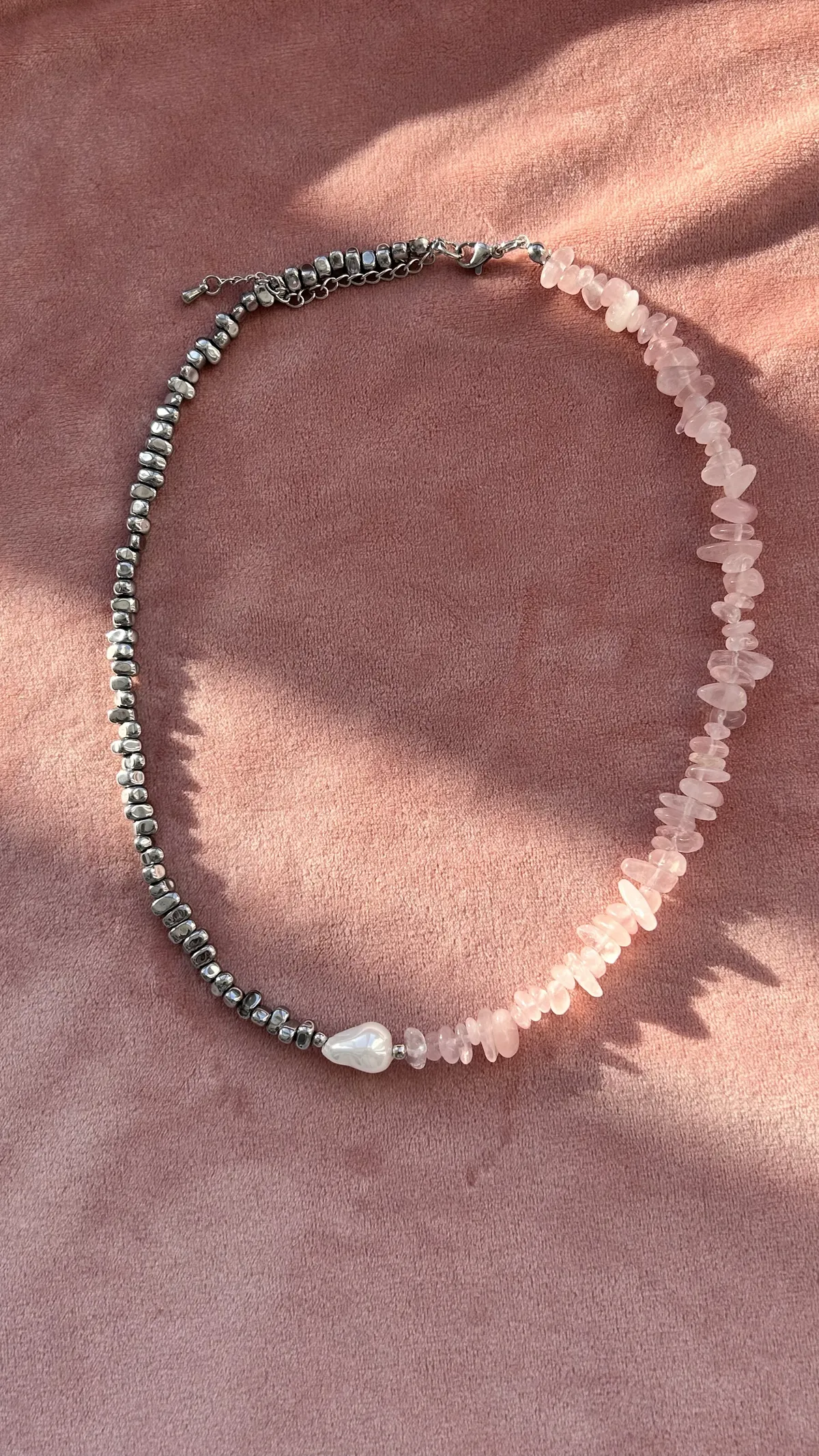 Колье с характером — сочетание матового розового кварца, майорки и прохладного металлика. Нежные розовые крошки плавно переходят в серебристые бусины, а между ними — барочная жемчужина, как точка притяжения взгляда.