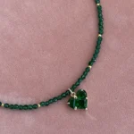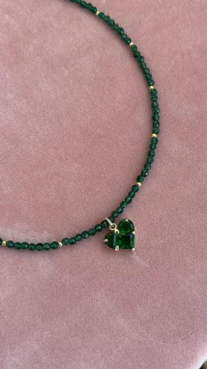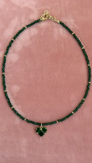 Стильное колье с зелёными бусинами фианитов и золотистой подвеской-сердцем станет ярким акцентом вашего наряда. Украшение универсально для повседневной носки и особых случаев. Регулируемая длина, качественная фурнитура