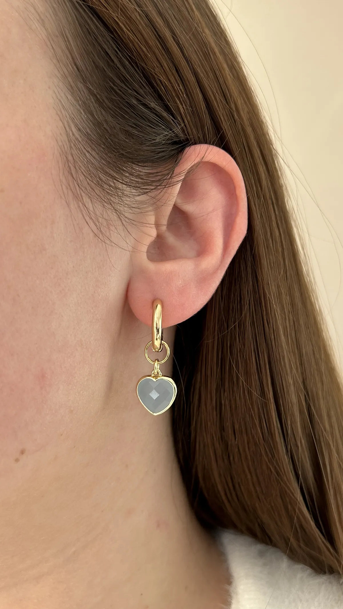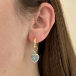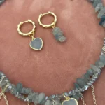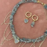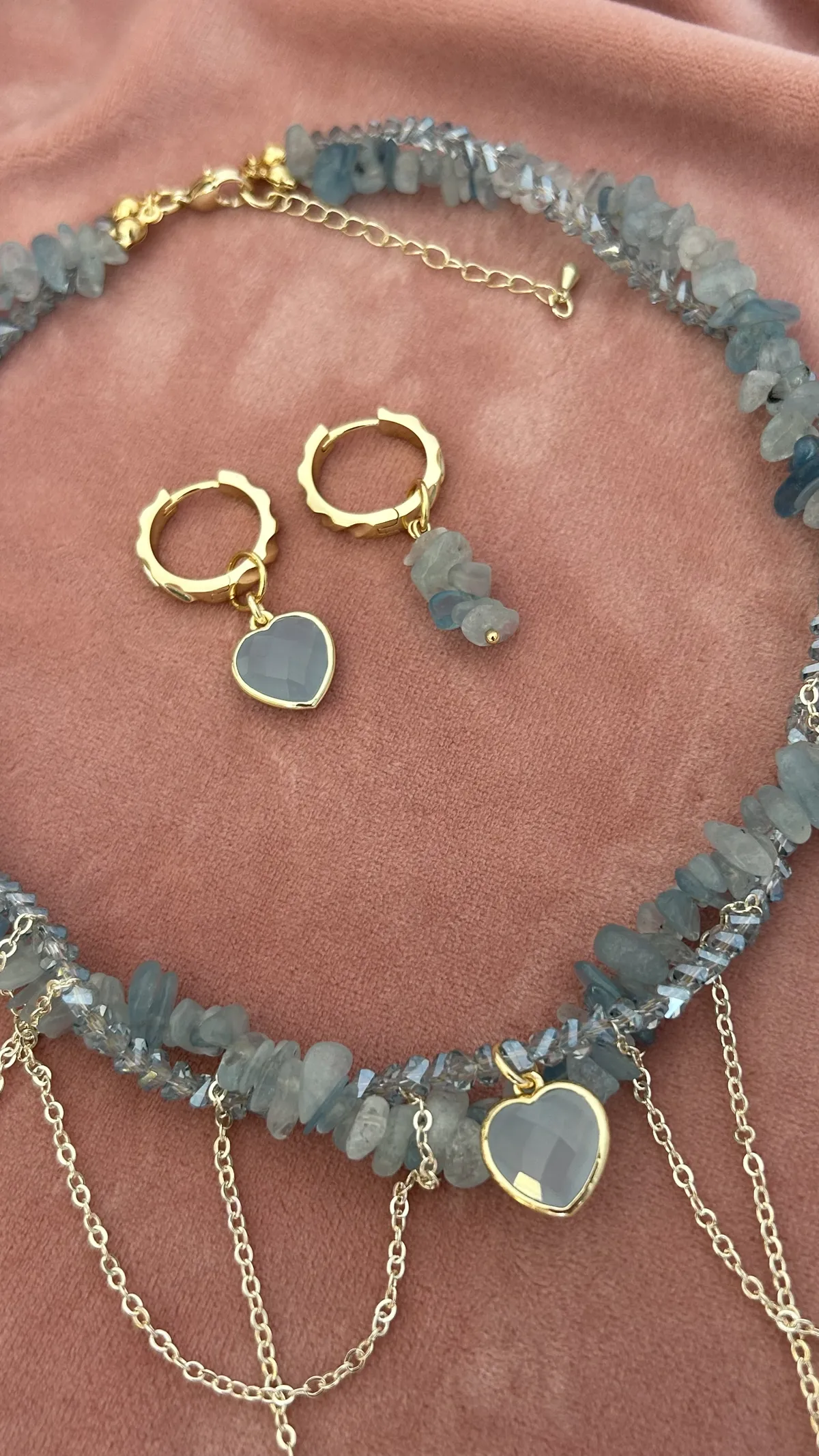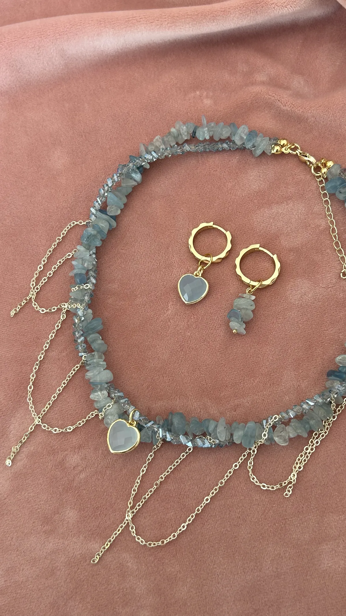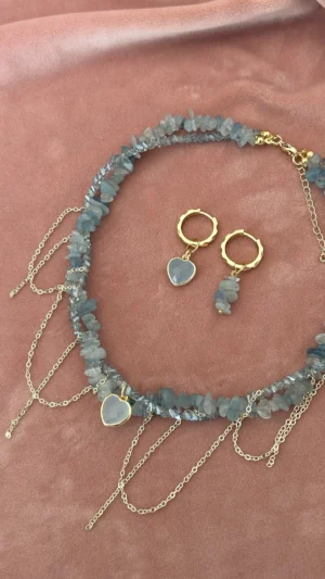 Комплект из колье и сережек с натуральным аквамарином и декоративными цепочками. Акцентная подвеска-сердце и гармоничные серьги на золотистой фурнитуре — выбор для элегантного образа.
