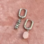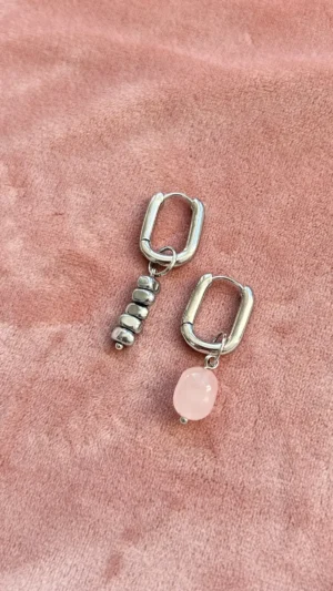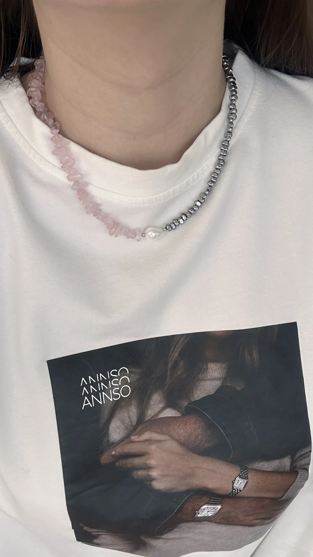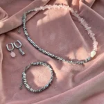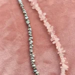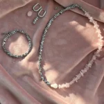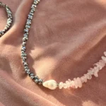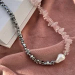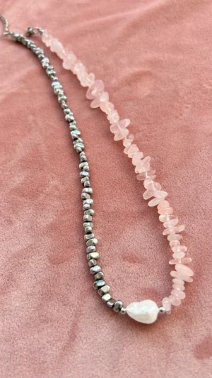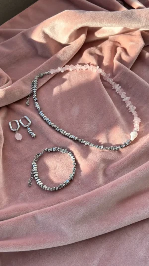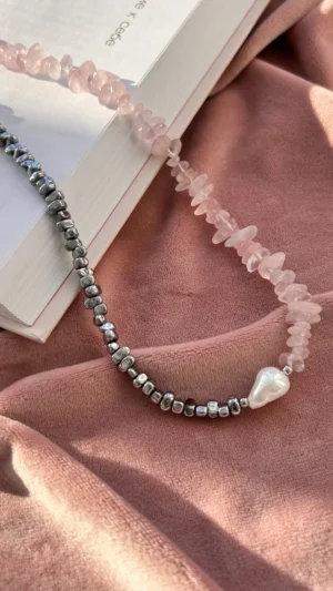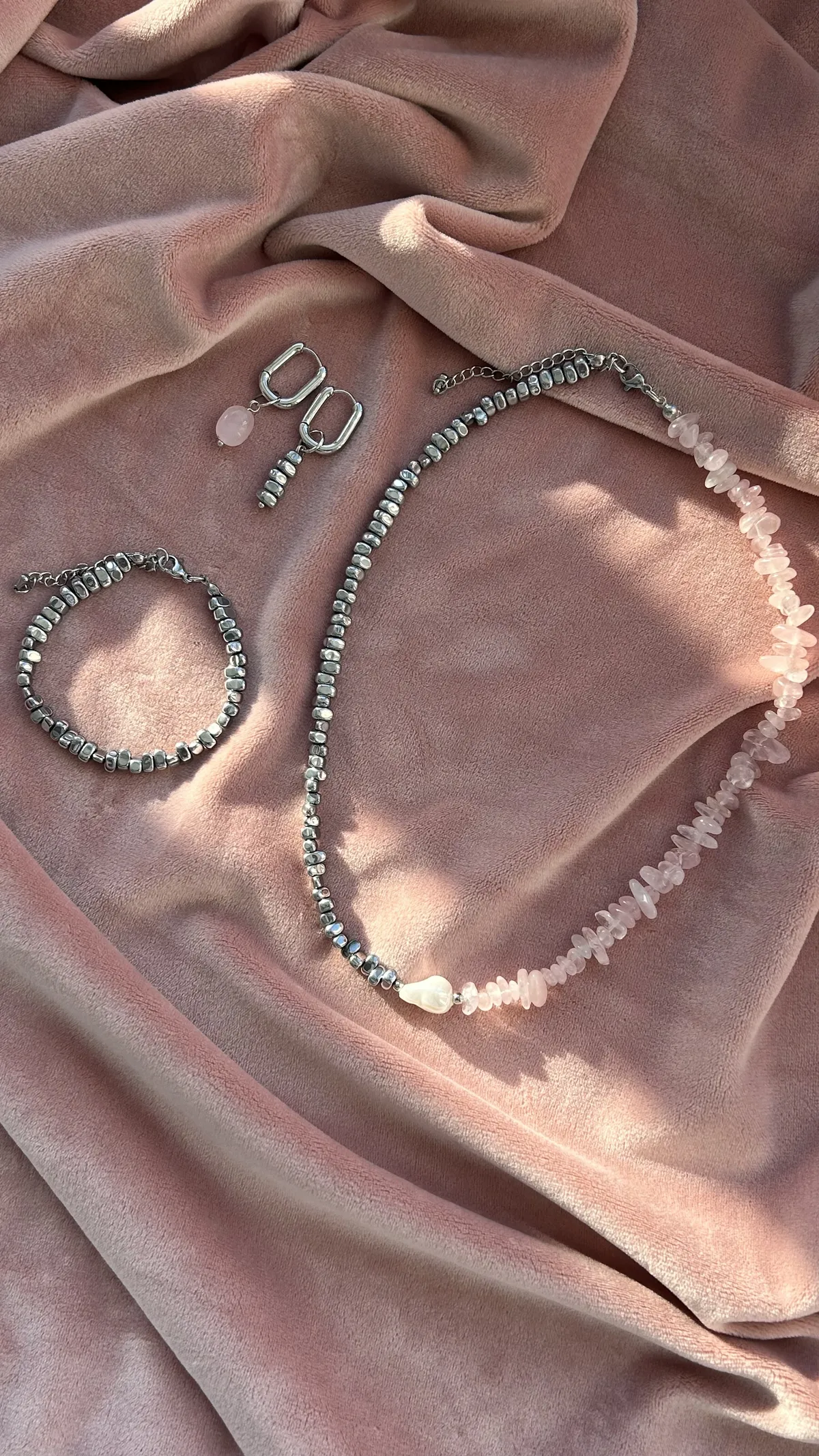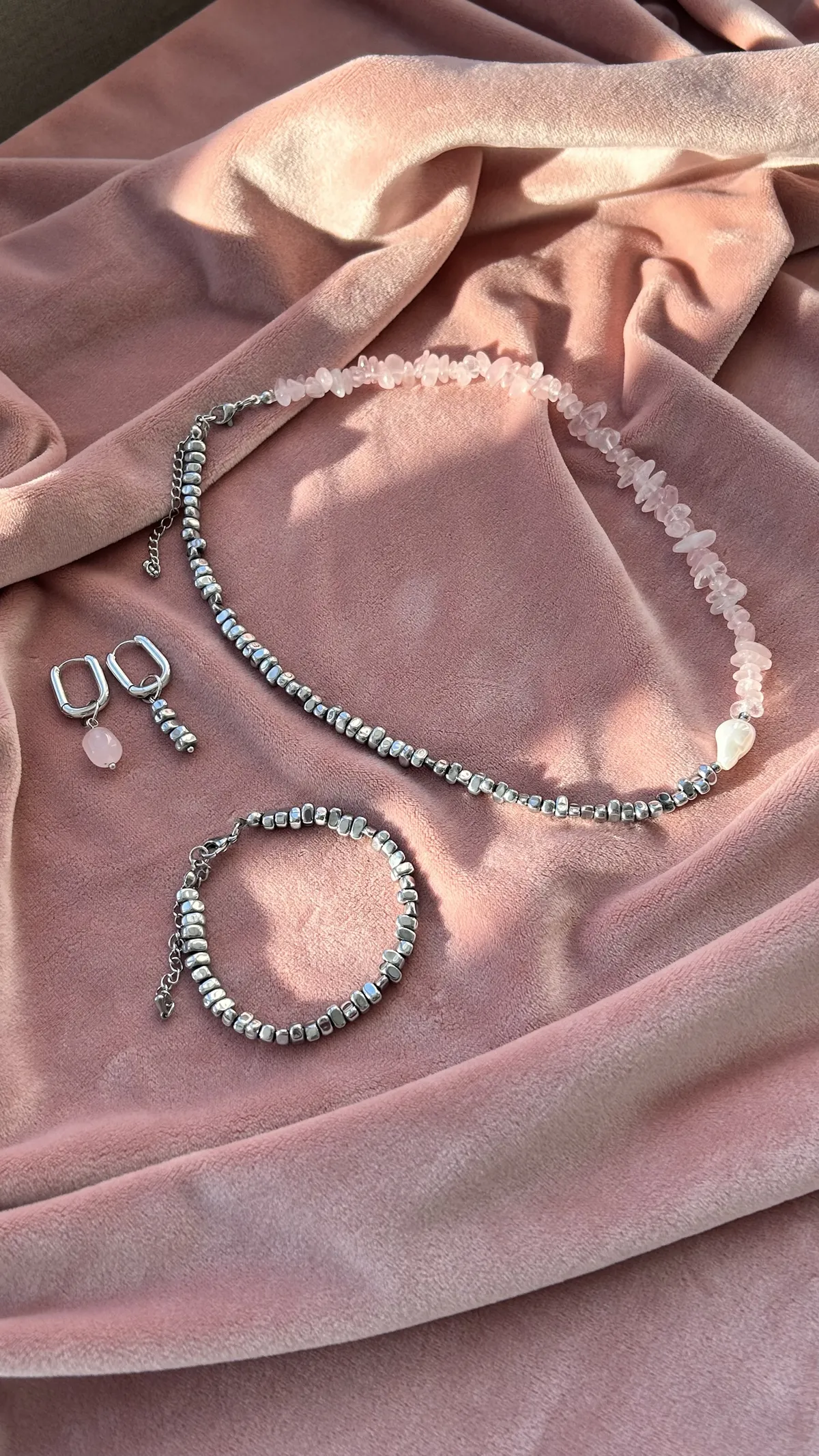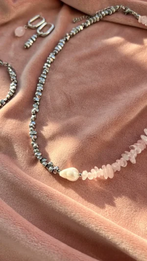 Комплект с характером — сочетание матового розового кварца, майорки и прохладного металлика. Нежные розовые крошки плавно переходят в серебристые бусины, а между ними — барочная жемчужина, как точка притяжения взгляда.