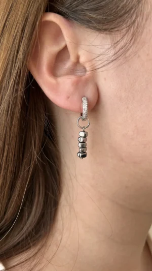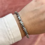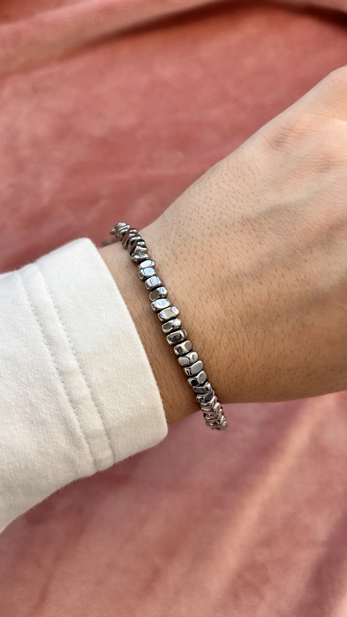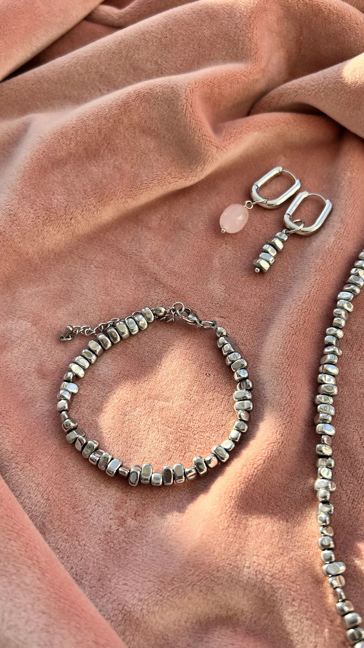 Браслет и асимметричные серьги повторяют этот дуэт оттенков: холод и тепло, лёгкая небрежность и современная геометрия.