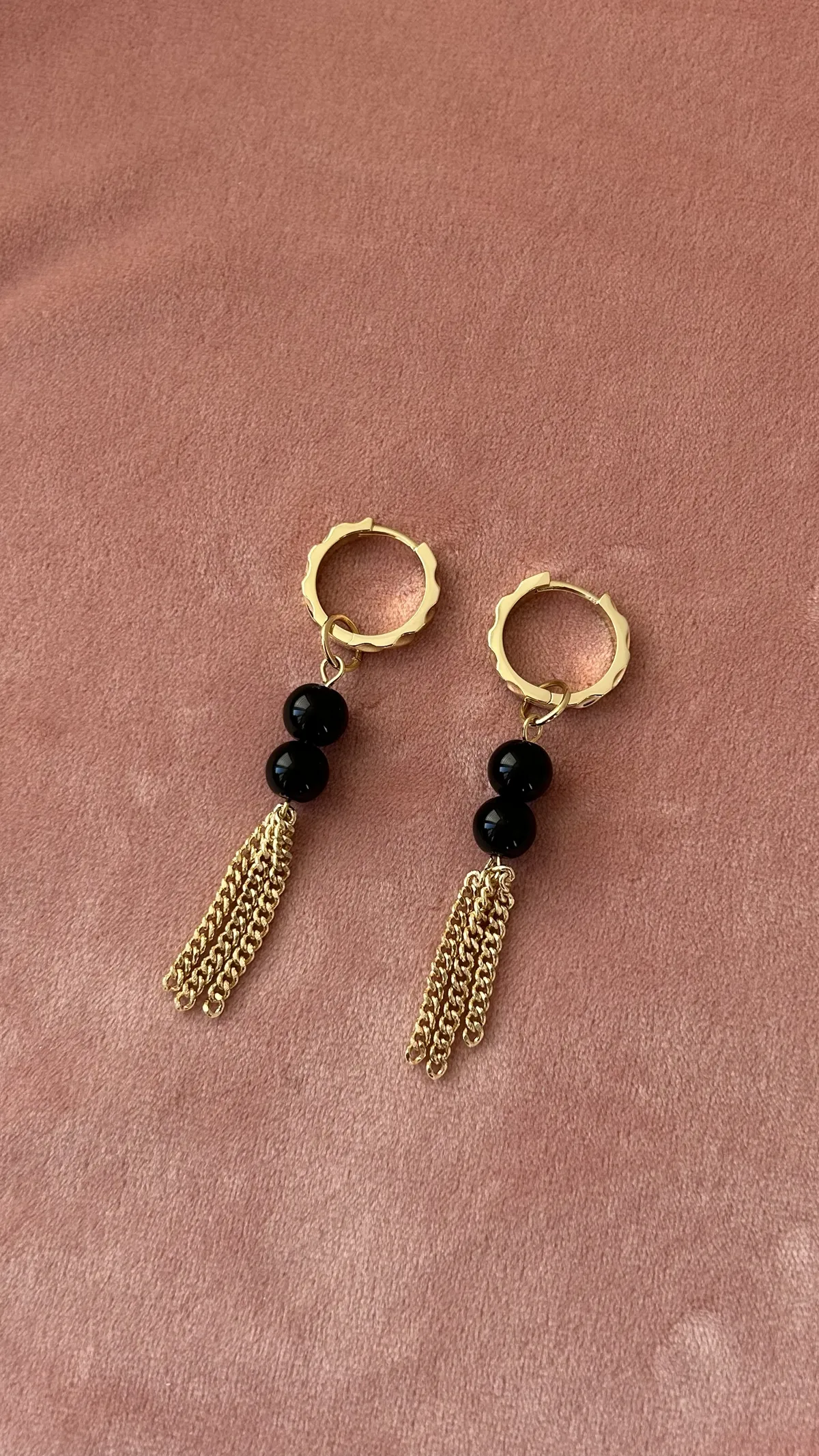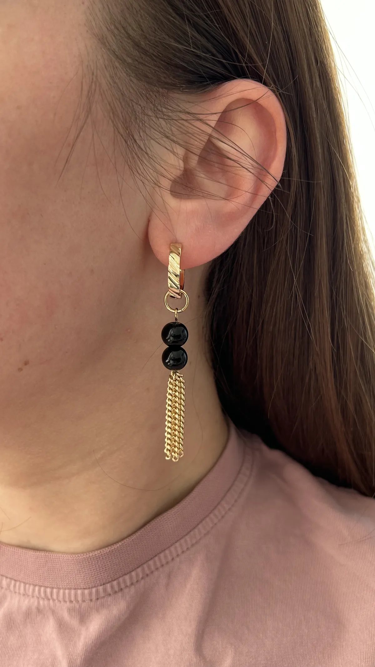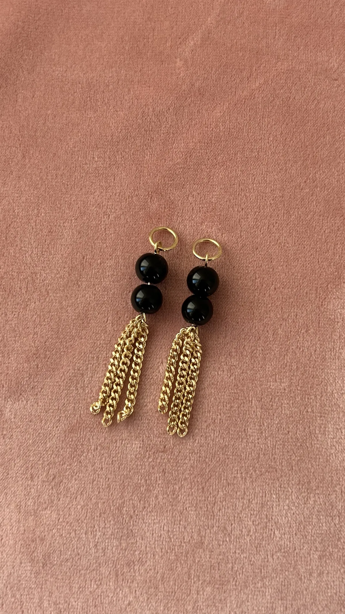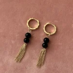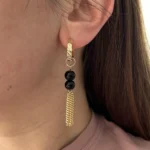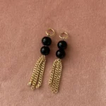 Стильная комбинация из двух черных бусин, дополненных изящной золотой цепочкой-кистью. Такой дизайн смотрится необычно и трендово, добавляя динамики и акцента вашему образу.