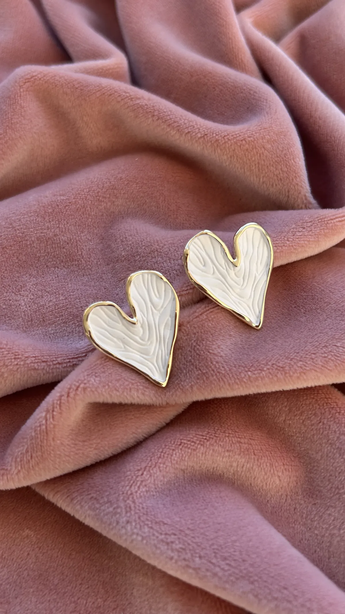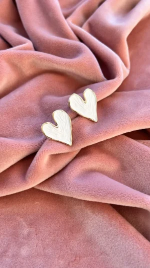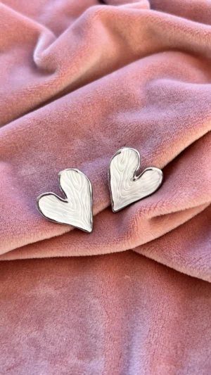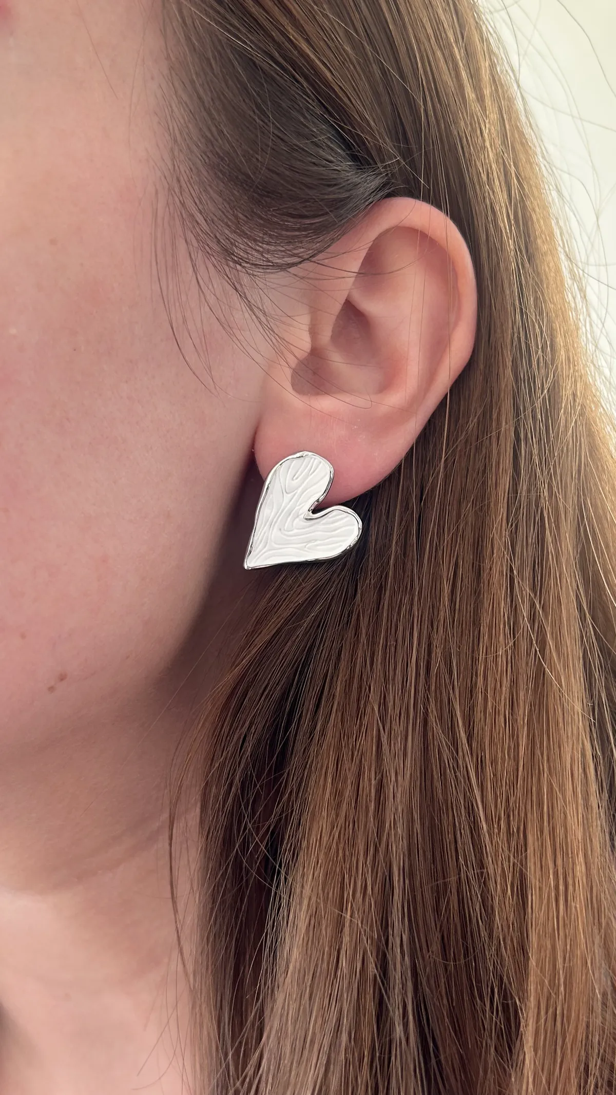 Объемная серьга в виде асимметричного белого сердца с рельефным узором, обрамлённая тонкой каймой. Такой неожиданный и современный взгляд на классическую форму делает украшение ярким акцентом для любого образа.